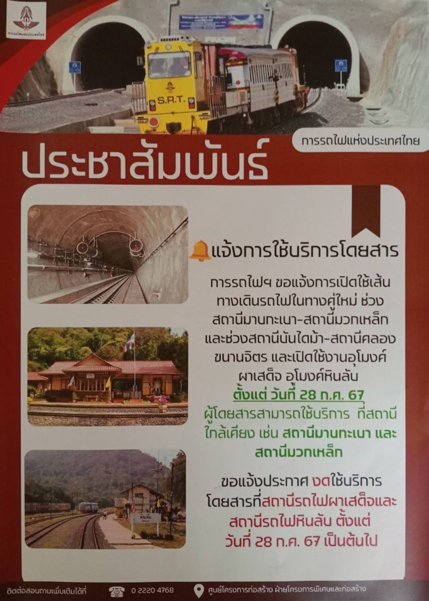 ขอแจ้งประกาศ งดใช้บริการโดยสารที่สถานีรถไฟผาเสด็จ และสถานีรถไฟหินลับ ตั้งแต่วันที่ 28 ก.ค. 2567 เป็นต้นไป