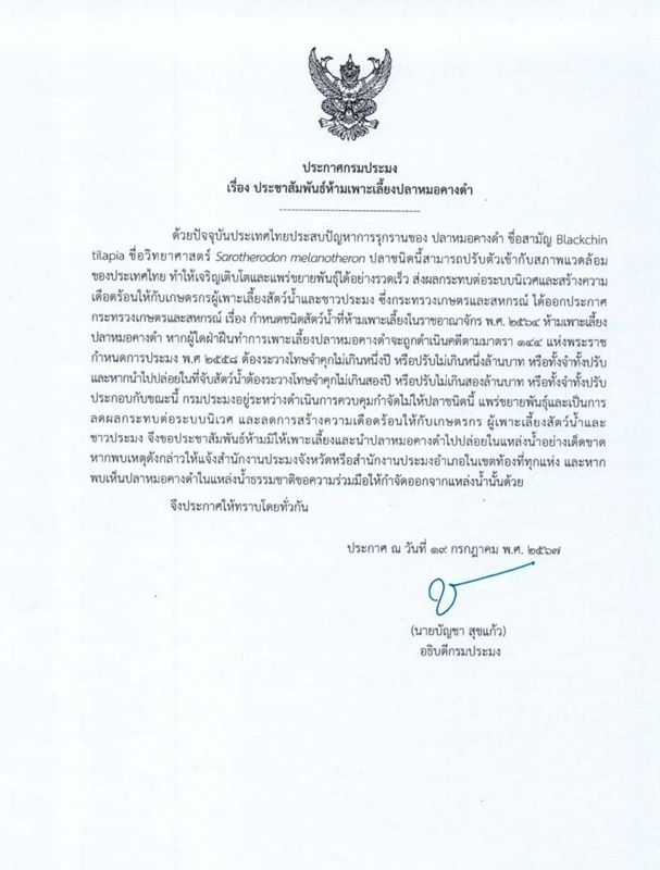 จึงขอประชาสัมพันธ์ต่อพี่น้องประชาชนห้ามมิให้เพาะเลี้ยง และนำปลาหมอคางดำไปปล่อยในแหล่งน้ำอย่างเด็ดขาด และหากพบเจอให้แจ้งสำนักงานประมงจังหวัดหรือสำนักงานประมงอำเภอในเขตท้องที่ทุกแห่ง และหากพบเห็นปลาหมอคางดำในแหล่งน้ำธรรมชาติขอความร่วมมือให้กำจัดออกจากแหล่งน้ำนั้นด้วย