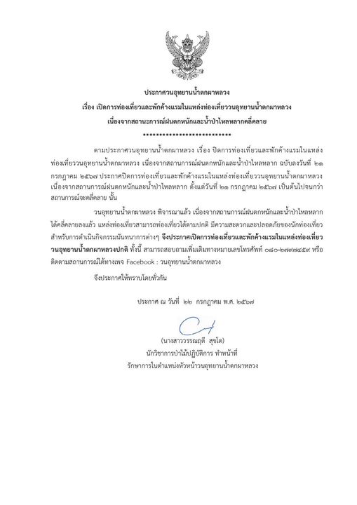 วนอุทยานน้ำตกผาหลวง พิจารณาแล้ว เนื่องจากสถานการณ์ฝนตกหนักและน้ำป่าไหลหลาก ได้คลี่คลายลงแล้ว แหล่งท่องเที่ยวสามารถท่องเที่ยวได้ตามปกติ มีความสะดวกและปลอดภัยของนักท่องเที่ยว สำหรับการดำเนินกิจกรรมนันทนาการต่างๆ จึงประกาศเปิดการท่องเที่ยวและพักค้างแรมในแหล่งท่องเที่ยว วนอุทยานน้ำตกผาหลวงปกติ สามารถสอบถามเพิ่มเติมทางหมายเลขโทรศัพท์ 080-2797459 หรือติดตามสถานการณ์ได้ทางเพจ Facebook : วนอุทยานน้ำตกผาหลวง