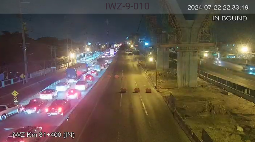 เวลา 22.30 น. วันที่ 22 กรกฎาคม 2567 ถนนพระราม 2 ฝั่งขาเข้า กทม. เจ้าหน้าที่กำลังทำงาน ปิดการจราจรช่องทางหลัก ในช่วงเขตพื้นที่ อ.เมือง จ.สมุทรสาคร และมีปริมาณรถมากที่ทยอยกลับเข้ากรุงเทพฯ ช่วงสะพานข้ามแม่น้ำท่าจีน การจราจรเคลื่อนตัวกันได้ช้าๆ ผ่านหน้าตลาดทะเลไทย ไปแล้วก็เคลื่อนตัวได้คล่องขึ้น