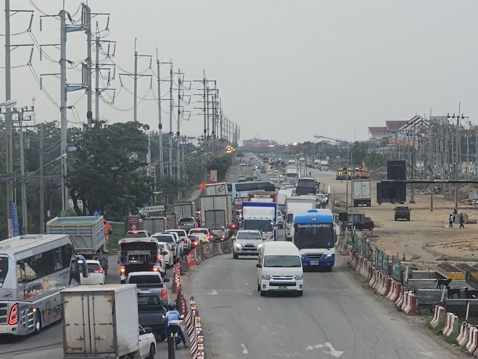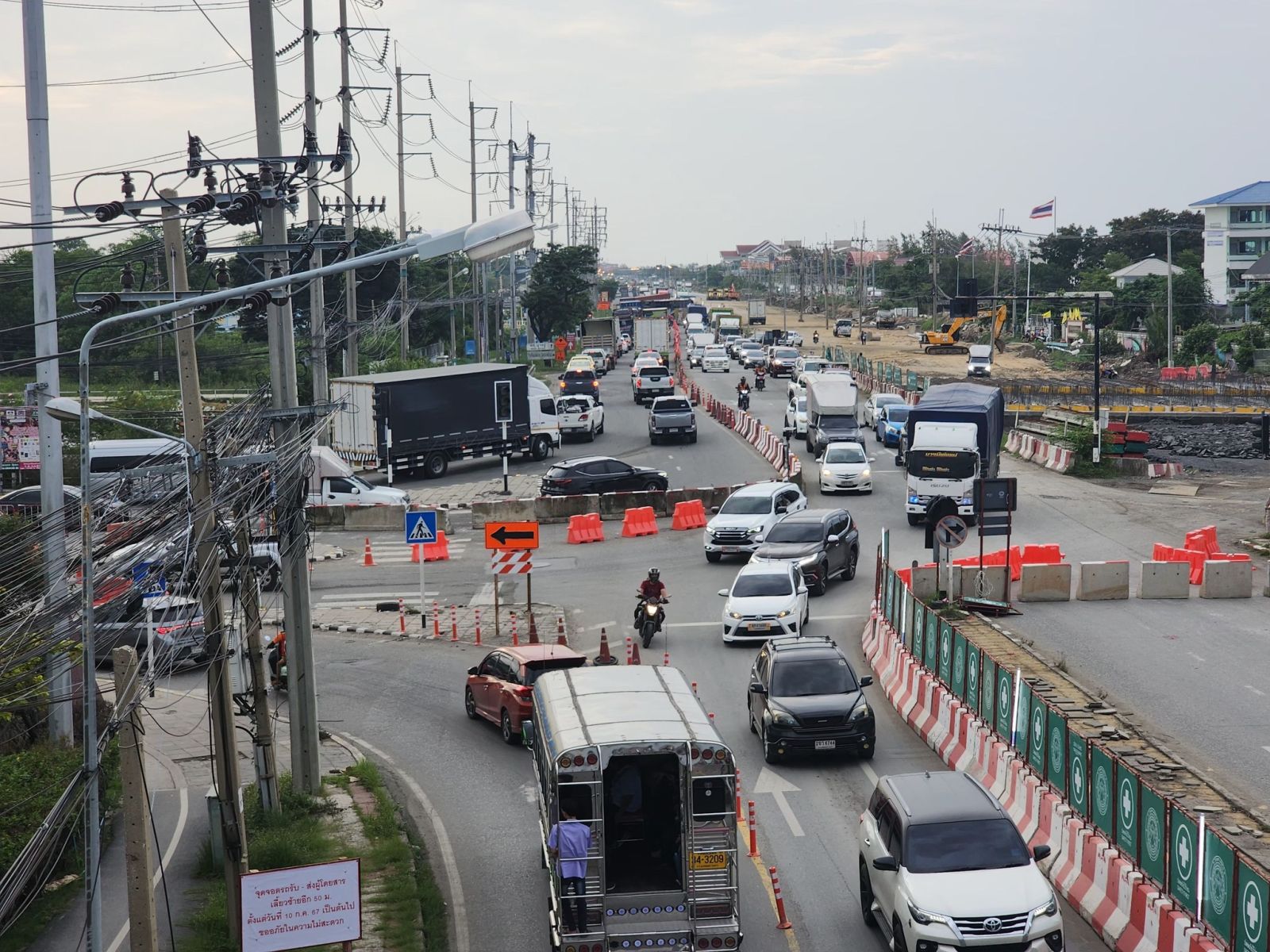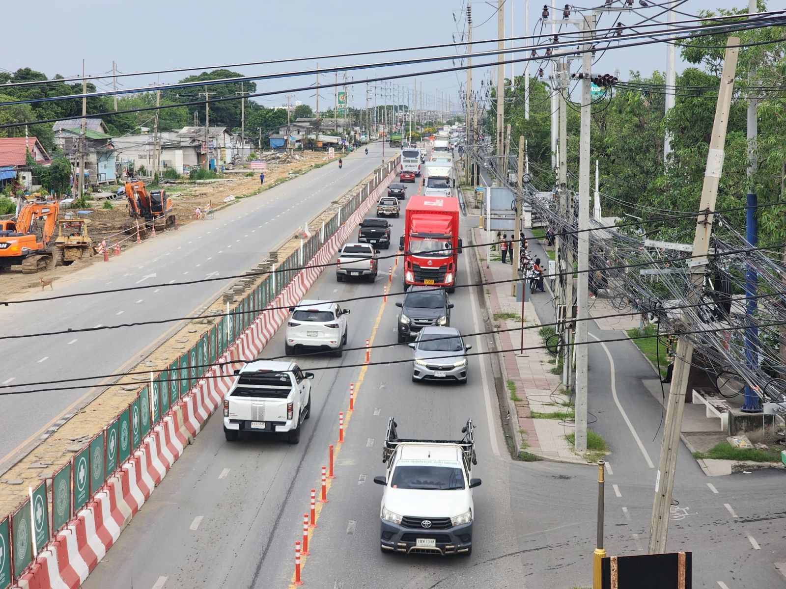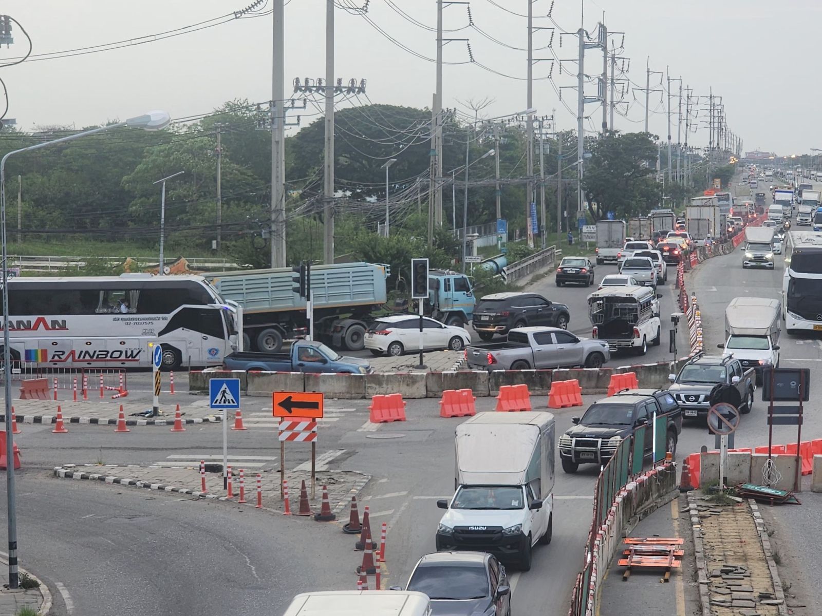 การจราจรผ่านแยกตำหรุ หลังปิดเบี่ยงการจราจร เพื่อเตรียมงานก่อสร้างสะพานข้ามแยก ไปเมื่อวาน (22 ก.ค.67) วันแรก