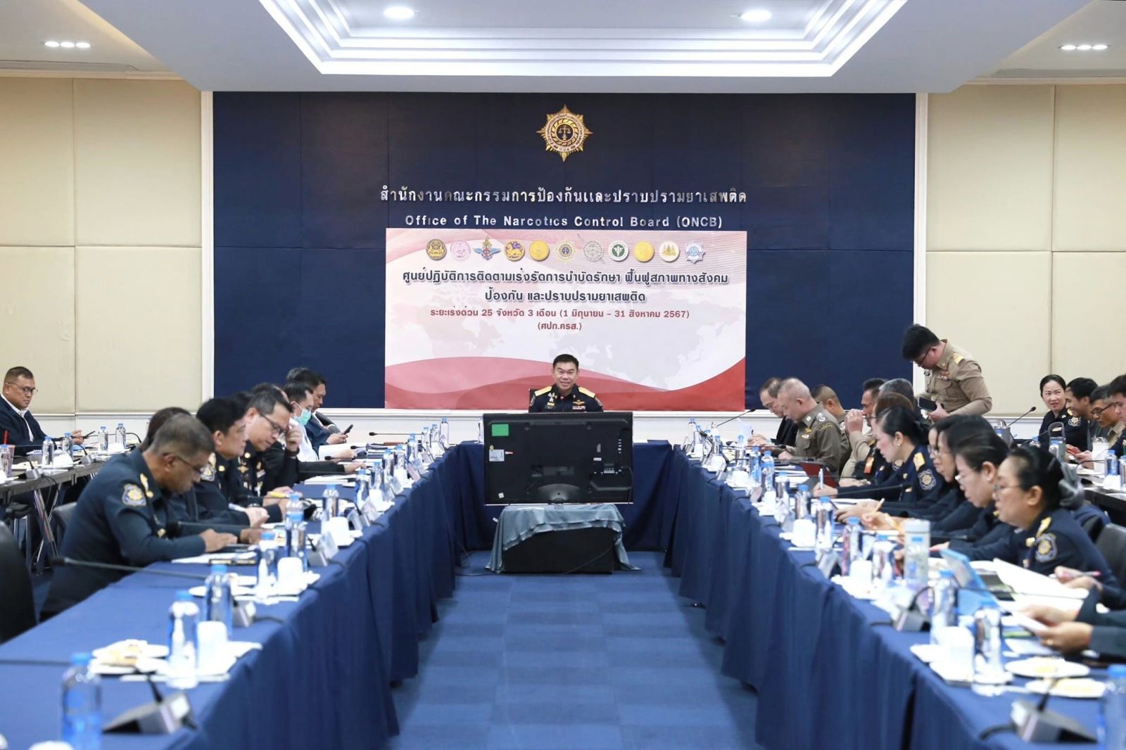 ในช่วงเริ่มต้นการประชุม พล.ต.ท.ภาณุรัตน์ หลักบุญ เลขาธิการ ป.ป.ส. ได้แจ้งที่ประชุมผลการดำเนินงานที่ผ่านมาว่า เมื่อวันที่ 18 กรกฎาคม 2567 นายเศรษฐา ทวีสิน นายกรัฐมนตรี มอบอุปกรณ์ในการป้องกันและตอบโต้กลุ่มผู้ค้ายาเสพติด เช่น กล้องซ่อนพราง ปืน Anti-Drone ให้แก่ พล.ต.อ.ต่อศักดิ์ สุขวิมล ผู้บัญชาการตำรวจแห่งชาติ และ พลเอก เจริญชัย หินเธาว์ ผู้บัญชาการทหารบก ณ บริเวณทางเชื่อมตึกไทยคู่ฟ้าและตึกสันติไมตรี ทำเนียบรัฐบาล ด้าน พ.ต.อ.ทวี สอดส่อง รัฐมนตรีว่าการกระทรวงยุติธรรม ร่วมรับฟังบรรยายสรุปรายงานการดำเนินงานการบูรณาการการทำงานร่วมกับทหาร ตำรวจ สาธารณสุขจังหวัด และหน่วยงานที่เกี่ยวข้อง กำหนดพื้นที่อำเภอธวัชบุรี เป็นพื้นที่ต้นแบบในการจัดการปัญหายาเสพติดในพื้นที่ มีกระบวนการคัดกรอง ส่งต่อตามกระบวนการ ให้แน่ใจว่าฟื้นฟูสมรรถภาพผู้ติดยาเสพติดได้สำเร็จ และมีการฝึกฝนอาชีพ การศึกษา เพื่อให้กลับมาใช้ชีวิตในสังคมตามเดิม ไม่กลับไปสู่วงจรของยาเสพติด