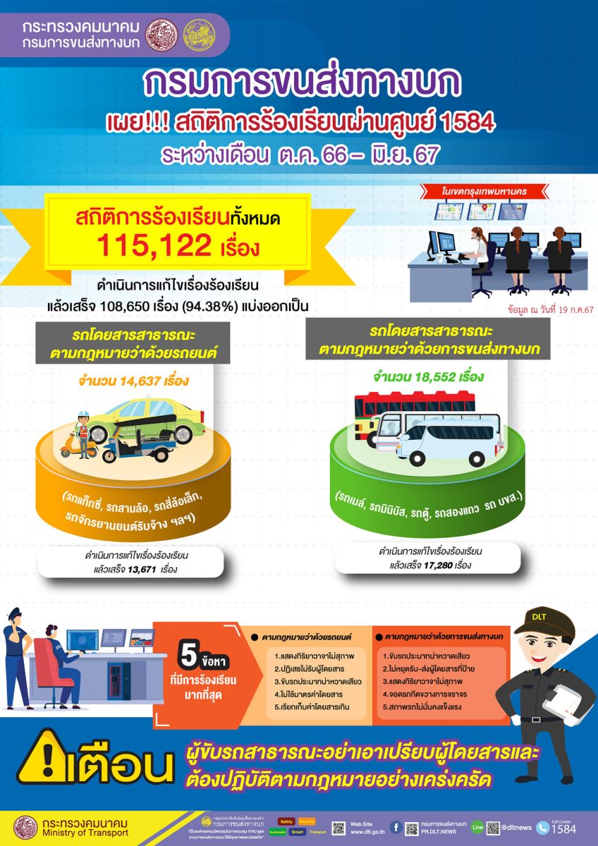 รองอธิบดีกรมการขนส่งทางบก เปิดเผยว่า สถิติการร้องเรียนผ่านศูนย์คุ้มครองผู้โดยสารรถสาธารณะ 1584 ประจำปีงบประมาณ 2567 ระหว่างเดือน ตุลาคม 2566 - มิถุนายน 2567 โดยมีเรื่องร้องเรียนทั้งหมด 115,122 เรื่อง และได้ดำเนินการแก้ไขเรื่องร้องเรียนแล้วเสร็จ 108,650 เรื่อง (94.38%) แบ่งออกเป็น
