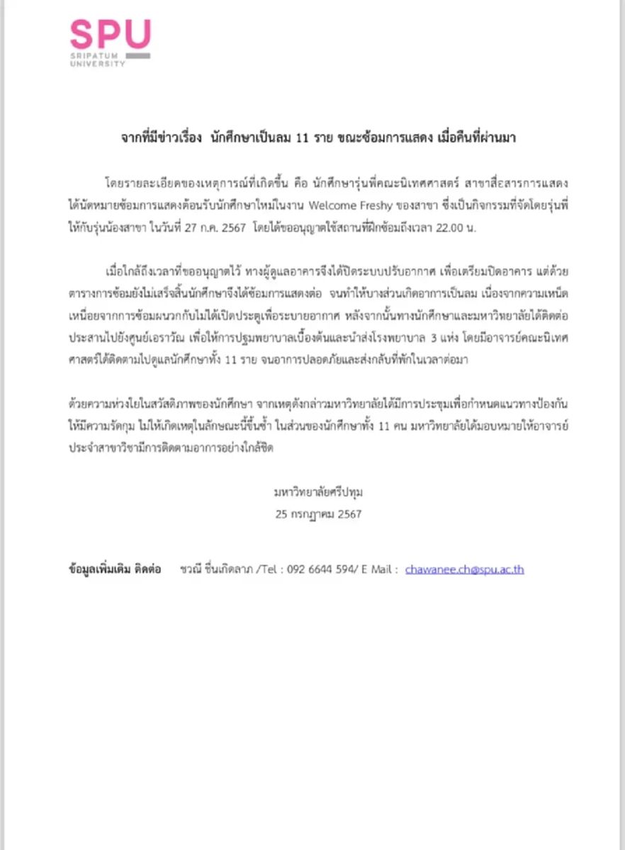 ล่าสุด มหาวิทยาลัยศรีปทุม ได้ออกเอกสารชี้แจง ระบุว่า "จากที่มีข่าวเรื่อง นักศึกษาเป็นลม 11 ราย ขณะซ้อมการแสดง เมื่อคืนที่ผ่านมา