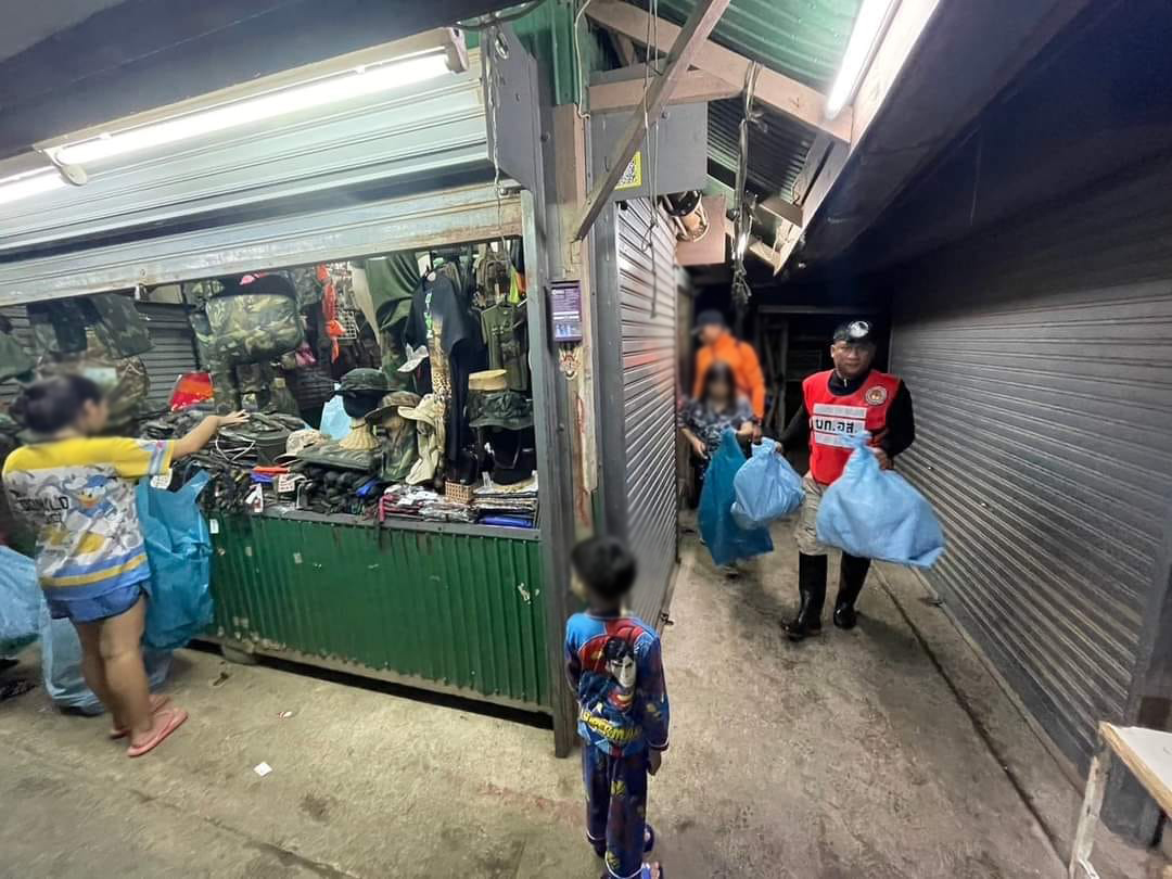 เจ้าหน้าที่ช่วยเหลือเร่งย้ายสิ่งของ สินค้าร้านค้าตลาดริมเมยขึ้นที่สูง หลังฝนตกหนักอย่างต่อเนื่องและน้ำเริ่มล้นตลิ่ง จ.ตาก