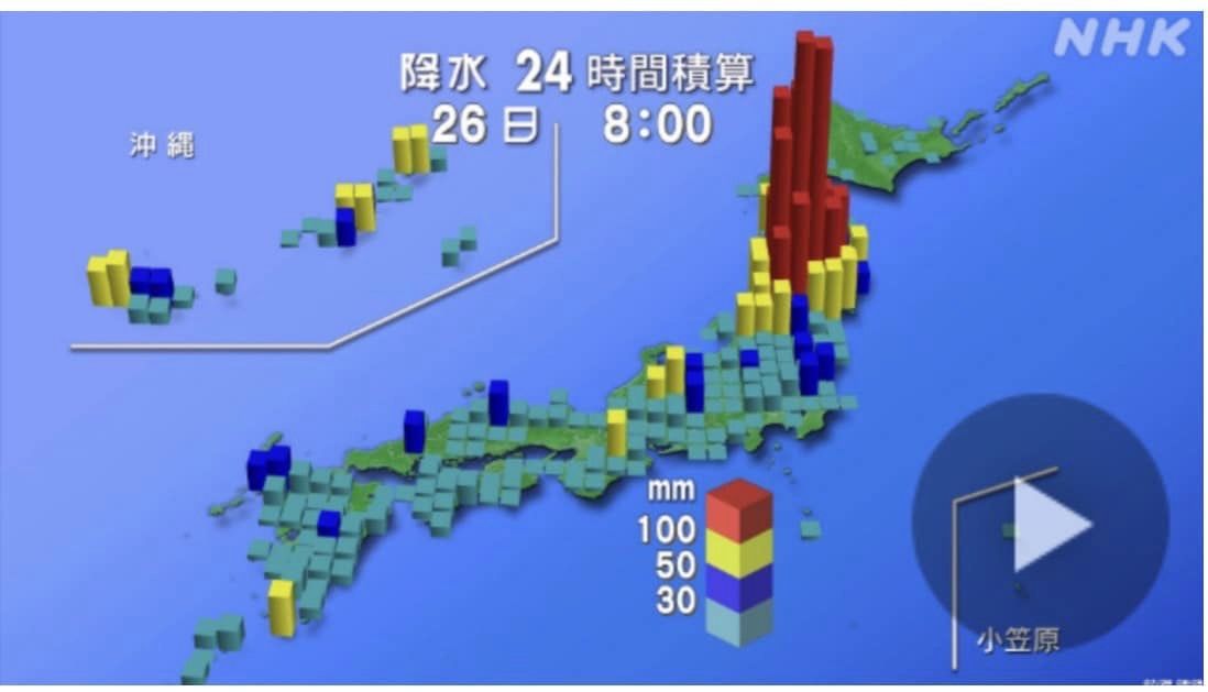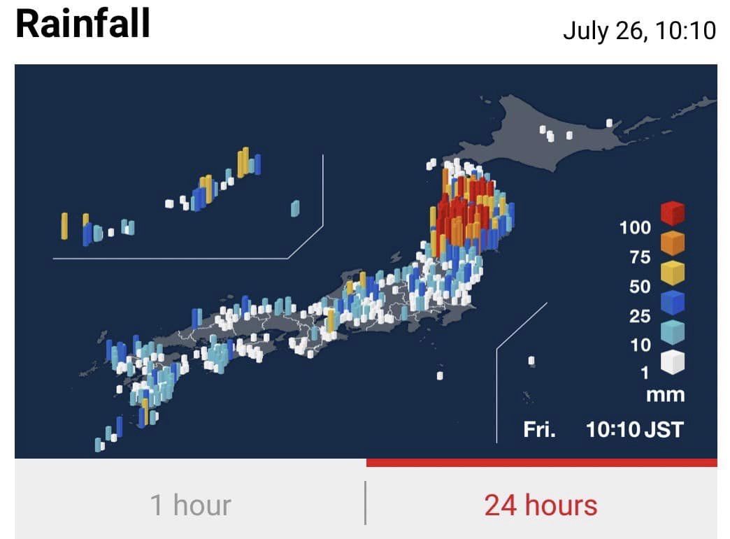 ปริมาณน้ำฝนสะสมจนถึงช่วงเช้าของวันที่ 27 กรกฎาคม 2567 ในพื้นที่ฝั่งทะเลญี่ปุ่นของภูมิภาคโทโฮคุ อาจมีปริมาณมากถึง 120 มิลลิเมตร และอาจมากถึง 150 มิลิเมตร ในวันที่ 28 กรกฎาคม 2567 ทั้งนี้ สำนักอุตุนิยมวิทยาญี่ปุ่นได้ประกาศให้ประชาชนในพื้นที่ดังกล่าว ระมัดระวังภัยจากดินถล่ม น้ำท่วมขังในพื้นที่ต่ำ และระดับน้ำในแม่น้ำเพิ่มขึ้นสูงจากสถานการณ์ฝนตกหนักด้วย