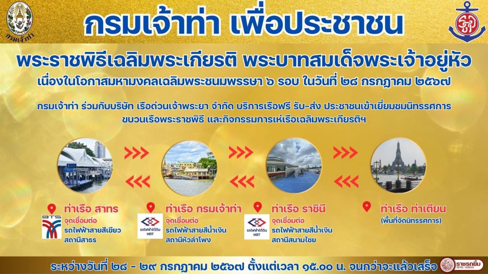 - กรมเจ้าท่า จัดบริการเรือข้ามฟากและเรือด่วนอำนวยความสะดวกประชาชน ในวันที่ 28-29 กรกฎาคม 2567 ตั้งแต่เวลา 15:00 น จนกว่าจะแล้วเสร็จ
