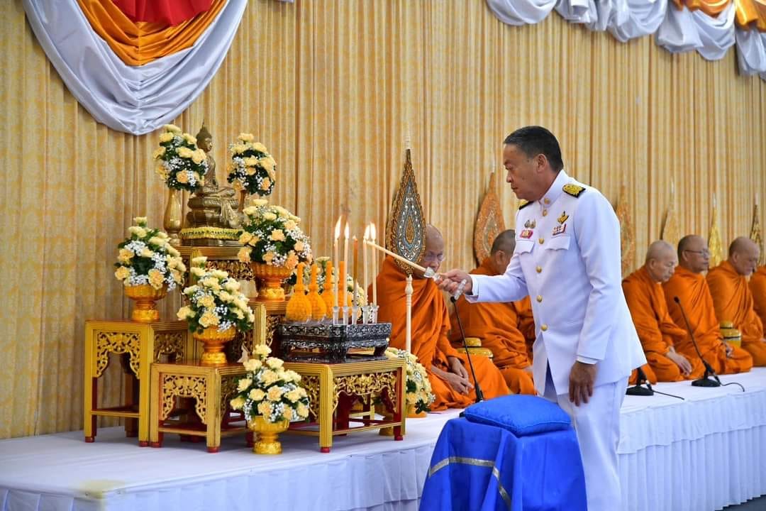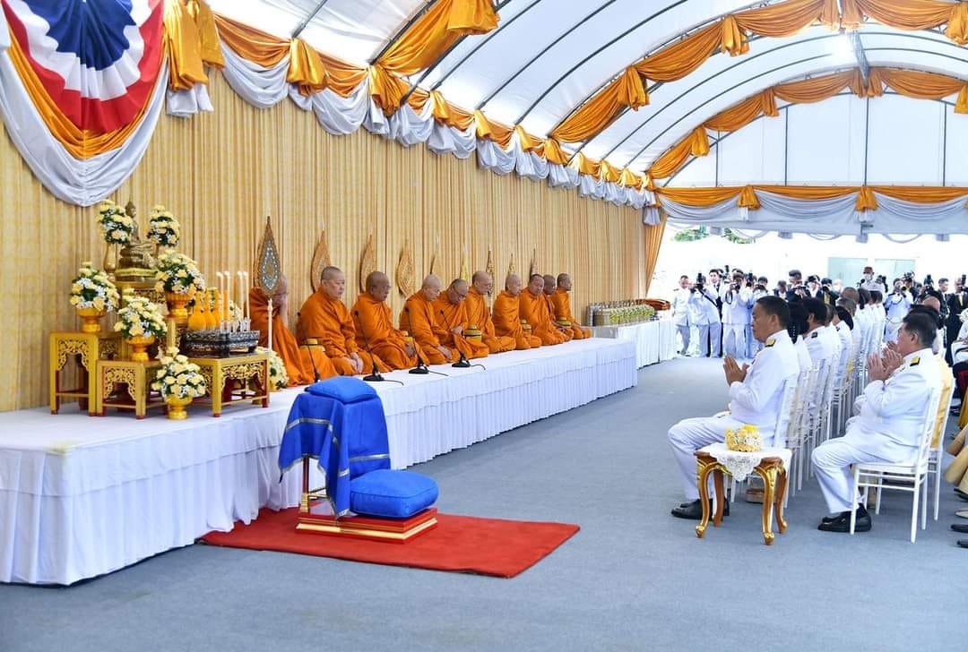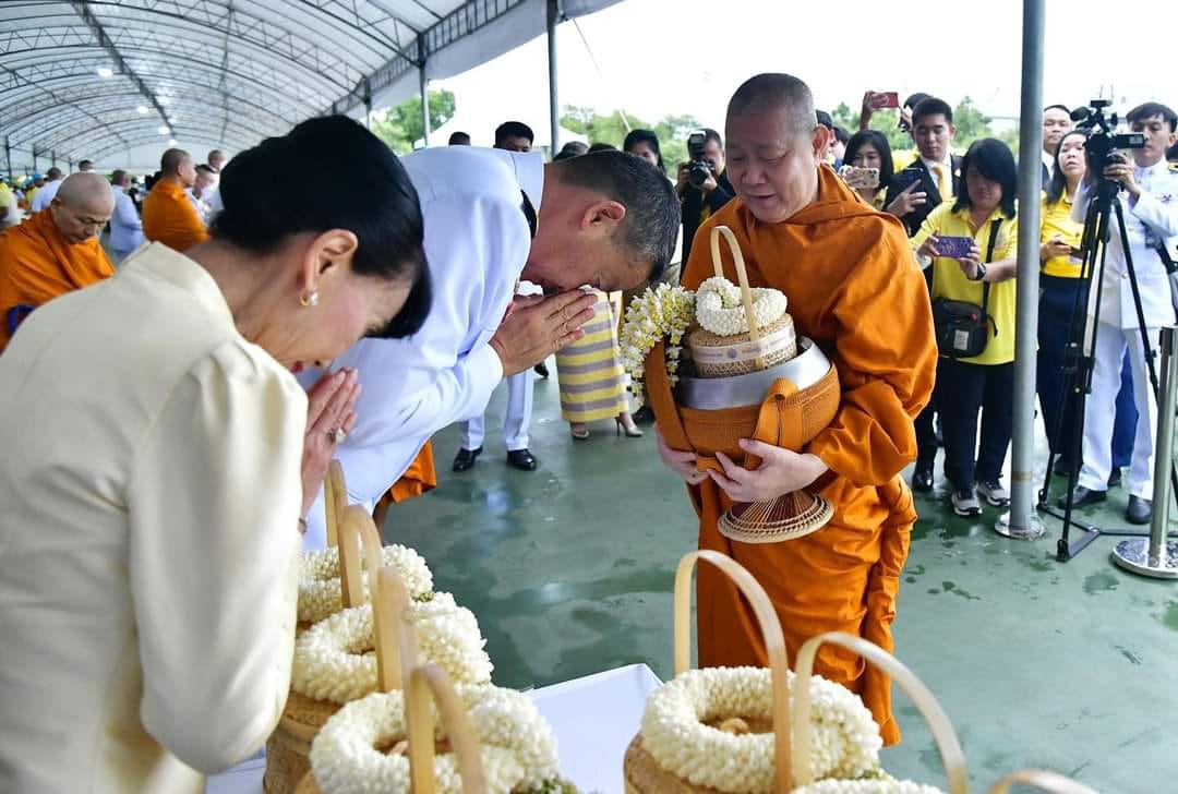 เมื่อนายกรัฐมนตรีและภริยาเดินทางถึงปะรำพิธีท้องสนามหลวง สมเด็จพระราชาคณะ พระราชาคณะ จำนวน 10 รูปขึ้นนั่งอาสน์สงฆ์ นายกรัฐมนตรีจุดธูปเทียนบูชาพระรัตนตรัย ถวายคำนับและถวายธูปเทียนแพหน้าพระบรมฉายาลักษณ์พระบาทสมเด็จพระเจ้าอยู่หัว เจ้าหน้าที่อาราธนาศีล สมเด็จพระราชาคณะ พระราชาคณะ จำนวน 10 รูป ให้ศีล พระสงฆ์เจริญพระพุทธมนต์