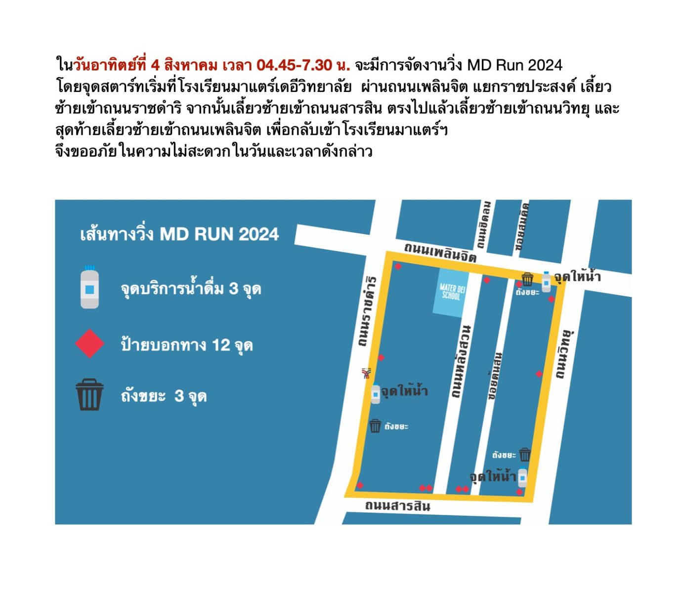 งานวิ่ง "MD Run 2024" จะเริ่มจากจุดสตาร์ทที่โรงเรียนมาแตร์เดอีวิทยาลัยผ่านถนนเพลินจิต แยกราชประสงค์ เลี้ยวซ้ายเข้าถนนราชดำริ จากนั้นเลี้ยวซ้ายเข้าถนนสารสิน ตรงไปแล้วเลี้ยวซ้ายเข้าถนนวิทยุ และสุดท้ายเลี้ยวซ้ายเข้าถนนเพลินจิต เพื่อกลับเข้าโรงเรียนมาแตร์ฯ