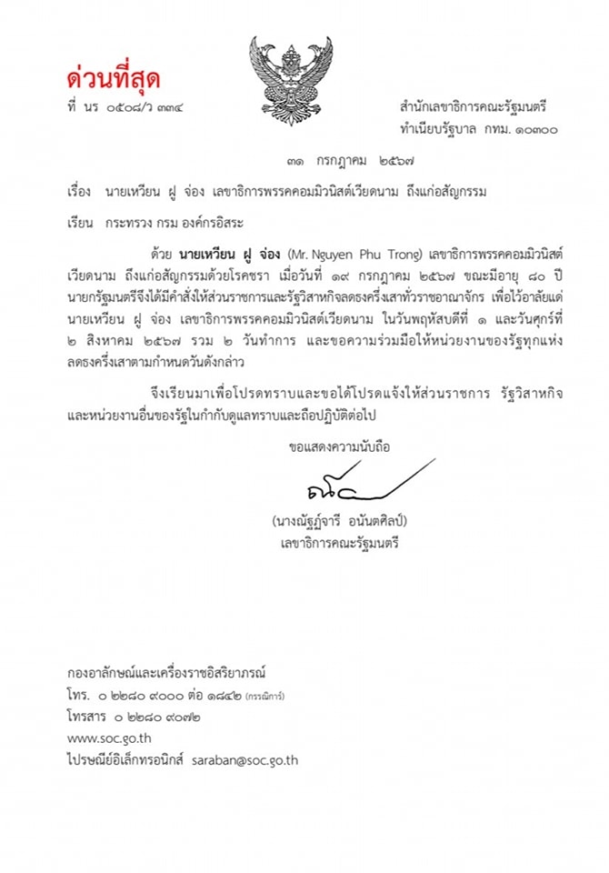 นายกฯ มีคำสั่งให้ลดธงครึ่งเสา 2 วัน 1-2 สิงหาคม 2567 เพื่อไว้อาลัยแด่นายเหวียน ฝู จ่อง (Mr. Nguyen Phu Trong) เลขาธิการพรรคคอมมิวนิสต์เวียดนาม