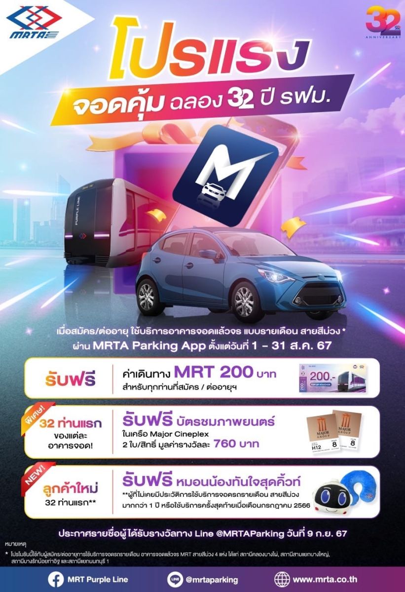 การรถไฟฟ้าขนส่งมวลชนแห่งประเทศไทย (รฟม.) ในฐานะหน่วยงานผู้กำกับดูแลการให้บริการรถไฟฟ้ามหานคร สายฉลองรัชธรรม (MRT สายสีม่วง) จัดกิจกรรม “จอดคุ้ม ฉลอง 32 ปี รฟม.” มอบสิทธิพิเศษให้แก่ผู้ที่สมัครหรือต่ออายุการใช้บริการจอดรถแบบรายเดือน ณ อาคารจอดแล้วจร MRT สายสีม่วง ผ่าน Application MRTA Parking ตั้งแต่วันนี้ – 31 สิงหาคม 2567 จะได้รับคูปองเติมเงิน (Top up Voucher) ค่าเดินทางมูลค่า 200 บาท เพื่อใช้เดินทางในระบบรถไฟฟ้า MRT สายสีม่วงและรถไฟฟ้ามหานคร สายเฉลิมรัชมงคล (MRT สายสีน้ำเงิน) และเนื่องในโอกาสครบรอบ 32 ปี รฟม. ลูกค้ารายใหม่ที่สมัครใช้บริการ 32 ท่านแรกจะได้รับหมอนที่ระลึก รฟม. และ ลูกค้า 32 ท่านแรกที่สมัครหรือต่ออายุการใช้บริการในแต่ละสถานีจะได้รับบัตรชมภาพยนตร์ในเครือเมเจอร์ซีนีเพล็กซ์ จำนวน 2 ใบ/ท่าน โดย รฟม. จะประกาศรายชื่อผู้ได้รับรางวัลผ่าน Line @mrtaparking ในวันที่ 9 กันยายน 2567 และผู้ใช้บริการสามารถนำคูปองเติมเงิน (Top up Voucher) มาใช้ในการชำระเงินหรือเป็นส่วนลดการซื้อหรือเติมเงินบัตรโดยสาร ณ ห้องออกบัตรโดยสาร MRT สายสีม่วง ได้ตั้งแต่วันที่ 9 กันยายน – 31 ตุลาคม 2567