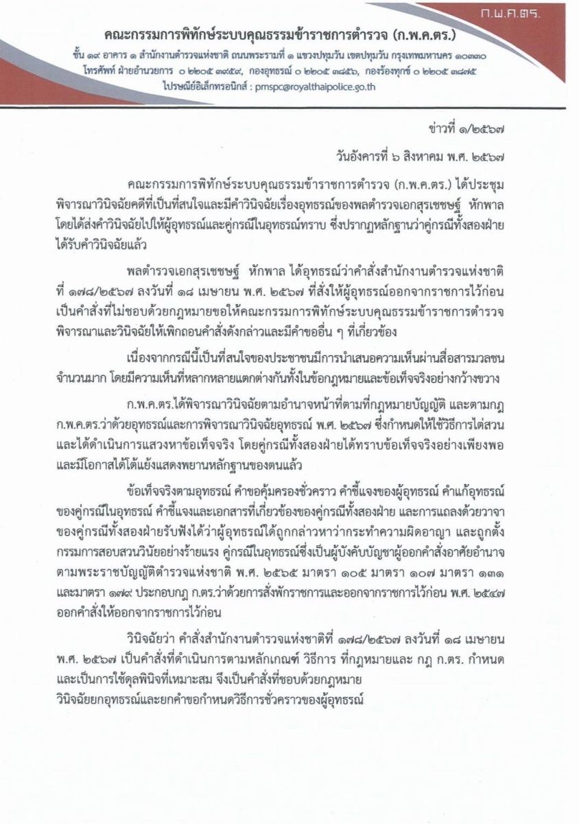 ก.พ.ค.ตร. ได้จัดส่งคำวินิจฉัยไปให้คู่กรณีทั้งสองฝ่ายทราบตามที่อยู่ที่คู่กรณีแต่ละฝ่ายได้แจ้งไว้ต่อ ก.พ.ค.ตร. แล้ว