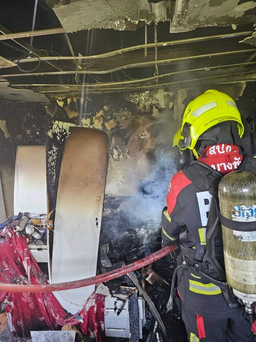 ลักษณะที่เกิดเหตุเป็นบ้านแฝดคอนกรีต 2 ชั้น ใช้เป็นที่พักอาศัย ต้นเพลิงเกิดขึ้นที่ชั้นบนภายในห้องนอน เพลิงลุกไหม้ หิ้งพระ ตู้เสื้อผ้าและฝ้าเพดาน พื้นที่เพลิงไหม้เสียหายโดยประมาณ 2 ตารางเมตร