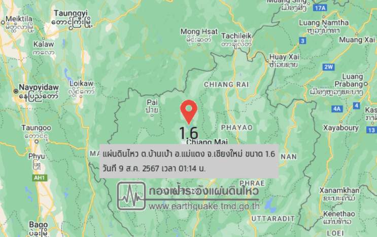 เวลา 01.14 น. วันที่ 9 สิงหาคม 2567 กองเฝ้าระวังแผ่นดินไหว กรมอุตุนิยมวิทยา แจ้งเหตุแผ่นดินไหว ขนาด 1.6 ความลึก 1 กม. ภายในพื้นที่ของ ต.บ้านเป้า อ.แม่แตง จ.เชียงใหม่ (19.20°N,99.07°E) ยังไม่มีรายงานผลกระทบจากแรงสั่นสะเทือน