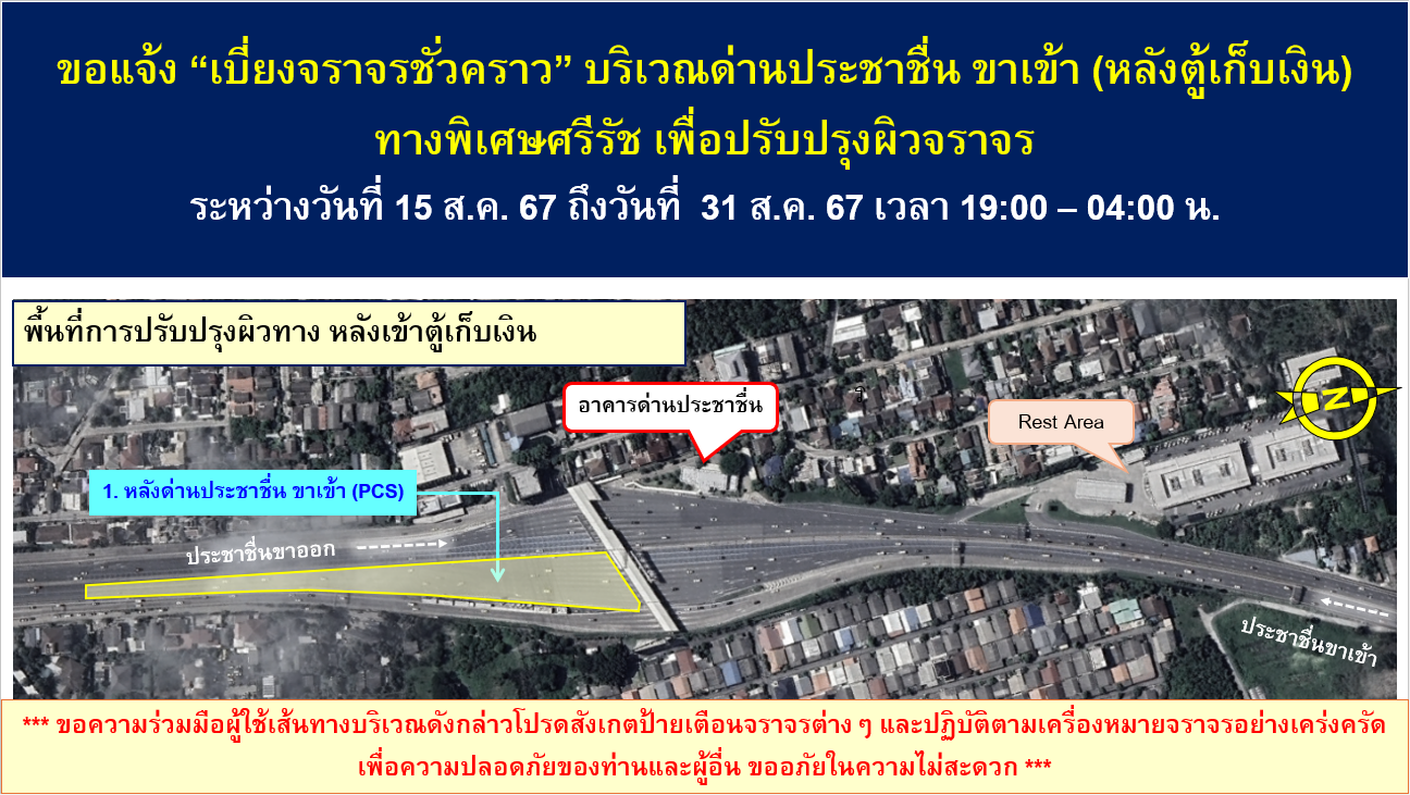 บริษัท ทางด่วนและรถไฟฟ้ากรุงเทพ จำกัด (มหาชน) หรือ BEM คำนึงถึงความปลอดภัยในการเดินทางของประชาชน จึงขอประชาสัมพันธ์แจ้งเบี่ยงการจราจรชั่วคราวทางพิเศษศรีรัช บริเวณหลังด่านประชาชื่น ขาเข้า (หลังตู้เก็บเงิน) เพื่อปรับปรุงผิวจราจร