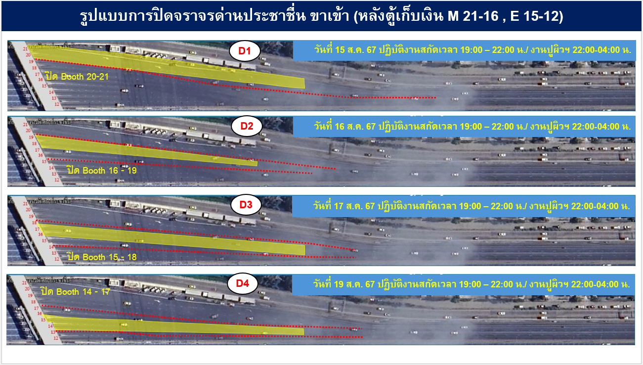 • วันที่ 15 ส.ค. 67 เบี่ยงการจราจร ตู้เก็บค่าผ่านทางที่ 20-21
