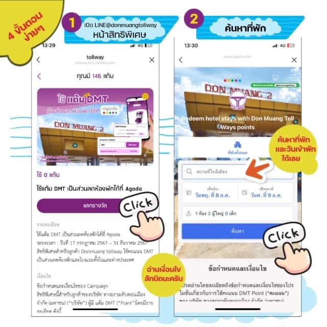 ผู้ใช้ทางดอนเมืองโทล์ลเวย์ สามารถนำแต้ม DMT แลกเป็นส่วนลด จองที่พักทั้งในประเทศและต่างประเทศได้ที่ Agoda โดยเข้าผ่าน Line Official ของทาง DMT แอดไลน์ @donmuangtollway
