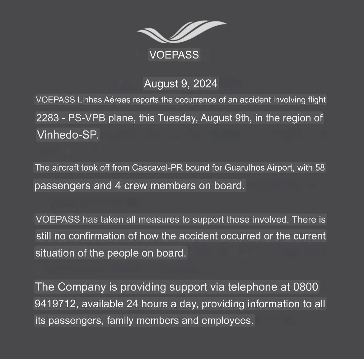 สำนักข่าวต่างประเทศรายงานว่า เครื่องบินใบพัด 2 เครื่องยนต์ ซึ่งกำลังพาผู้โดยสาร 58 คน กับลูกเรืออีก 4 คน เดินทางจากเมืองคาสคาวีล ของรัฐปารานา ทางตอนใต้ของประเทศบราซิล ไปยังสนามบินหลักของรัฐเซาเปาโลก ตกที่เมืองวินเยโด (Vinhedo) ในรัฐเซาเปาโล เมื่อวันศุกร์ที่ 9 สิงหาคม 2567 ตามเวลาท้องถิ่น ตรงกับเวลาประเทศไทย 00.10 น. (วันที่ 10 ส.ค.67)