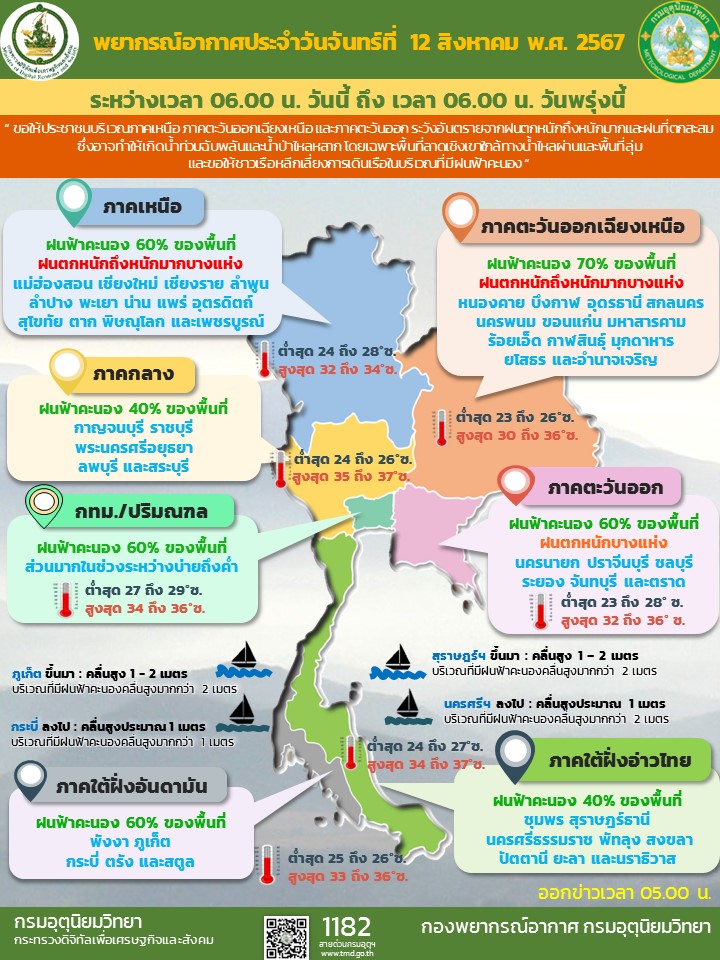 ลักษณะอากาศทั่วไป วันที่ 12 สิงหาคม 2567 พยากรณ์อากาศ 24 ชั่วโมงข้างหน้า ประเทศไทยมีฝนเพิ่มขึ้นและมีฝนตกหนักถึงหนักมากบางแห่งในภาคเหนือ ภาคตะวันออกเฉียงเหนือ และมีฝนตกหนักบางแห่งในภาคตะวันออก