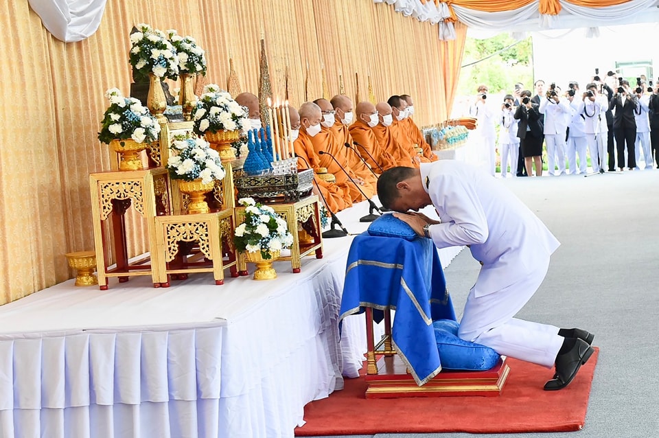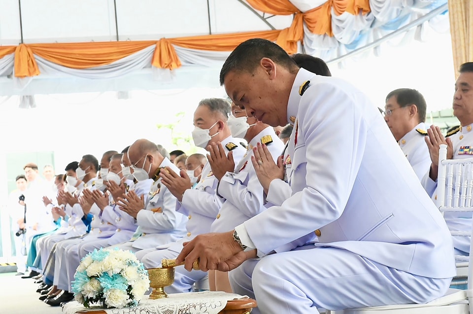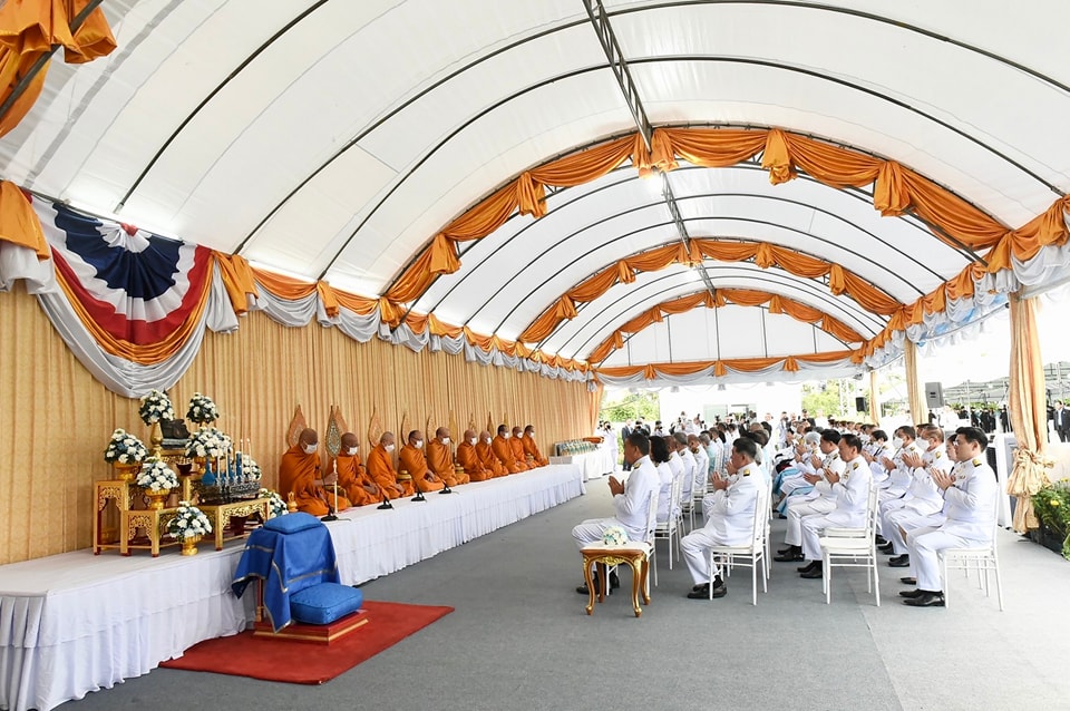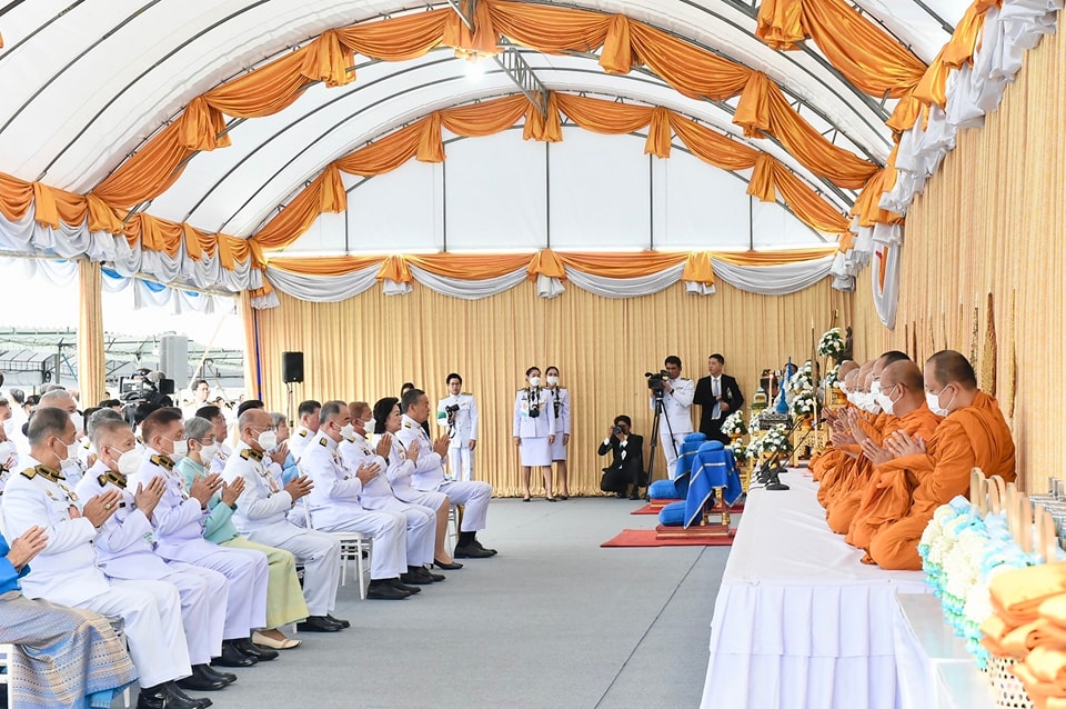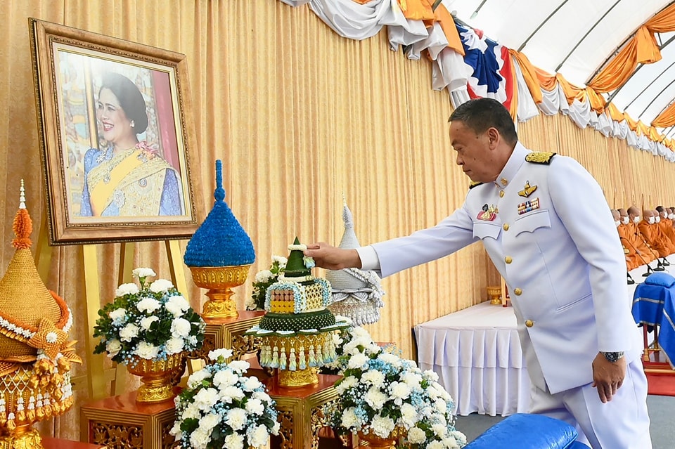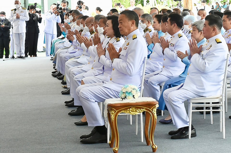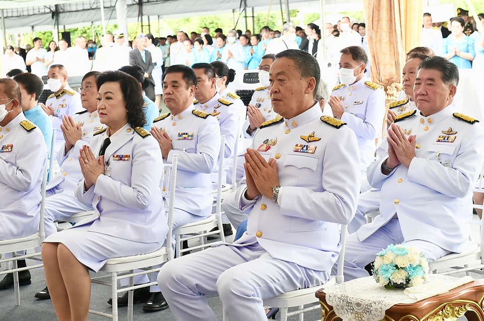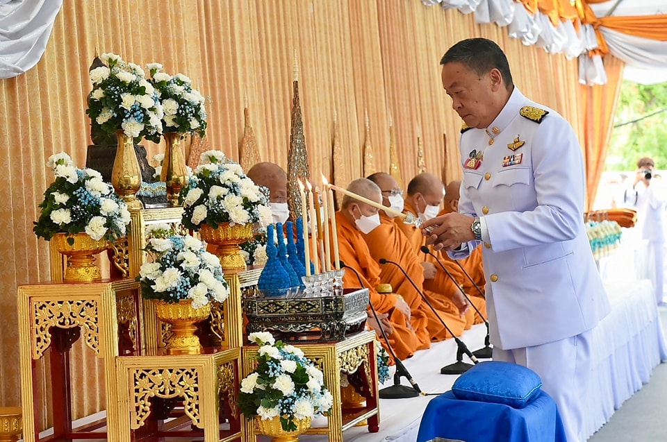 เมื่อ นายกรัฐมนตรีและภริยา เดินทางถึงปะรำพิธีท้องสนามหลวง สมเด็จพระราชาคณะ พระราชาคณะ จำนวน 10 รูปขึ้นนั่งอาสน์สงฆ์ นายกรัฐมนตรีจุดธูปเทียนบูชาพระรัตนตรัย ถวายคำนับและถวายธูปเทียนแพหน้าพระฉายาลักษณ์สมเด็จพระนางเจ้าสิริกิติ์ พระบรมราชินีนาถ พระบรมราชชนนีพันปีหลวง เจ้าหน้าที่อาราธนาศีล สมเด็จพระราชาคณะ พระราชาคณะ จำนวน 10 รูป ให้ศีล พระสงฆ์เจริญพระพุทธมนต์