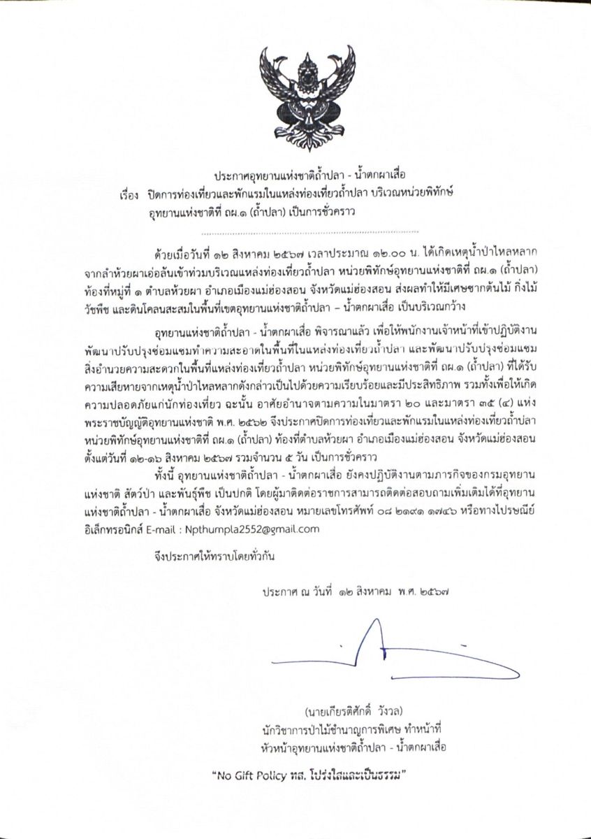 ทั้งนี้ อุทยานแห่งชาติถ้ำปลา-น้ำตกผาเสื่อ ยังคงปฏิบัติงานตามภารกิจของกรมอุทยานแห่งชาติ สัตว์ป่า และพันธุ์พืช เป็นปกติ โดยผู้มาติดต่อราชการ สามารถติดต่อสอบถามเพิ่มเติมได้ที่ อุทยานแห่งชาติถ้ำปลา-น้ำตกผาเสื่อ จังหวัดแม่ฮ่องสอน หมายเลขโทรศัพท์ 08 2191 1746 หรือทางไปรษณีย์อิเล็กทรอนิกส์ E-mail : Nothumpla2552@gmail.com จึงประกาศให้ทราบโดยทั่วกัน