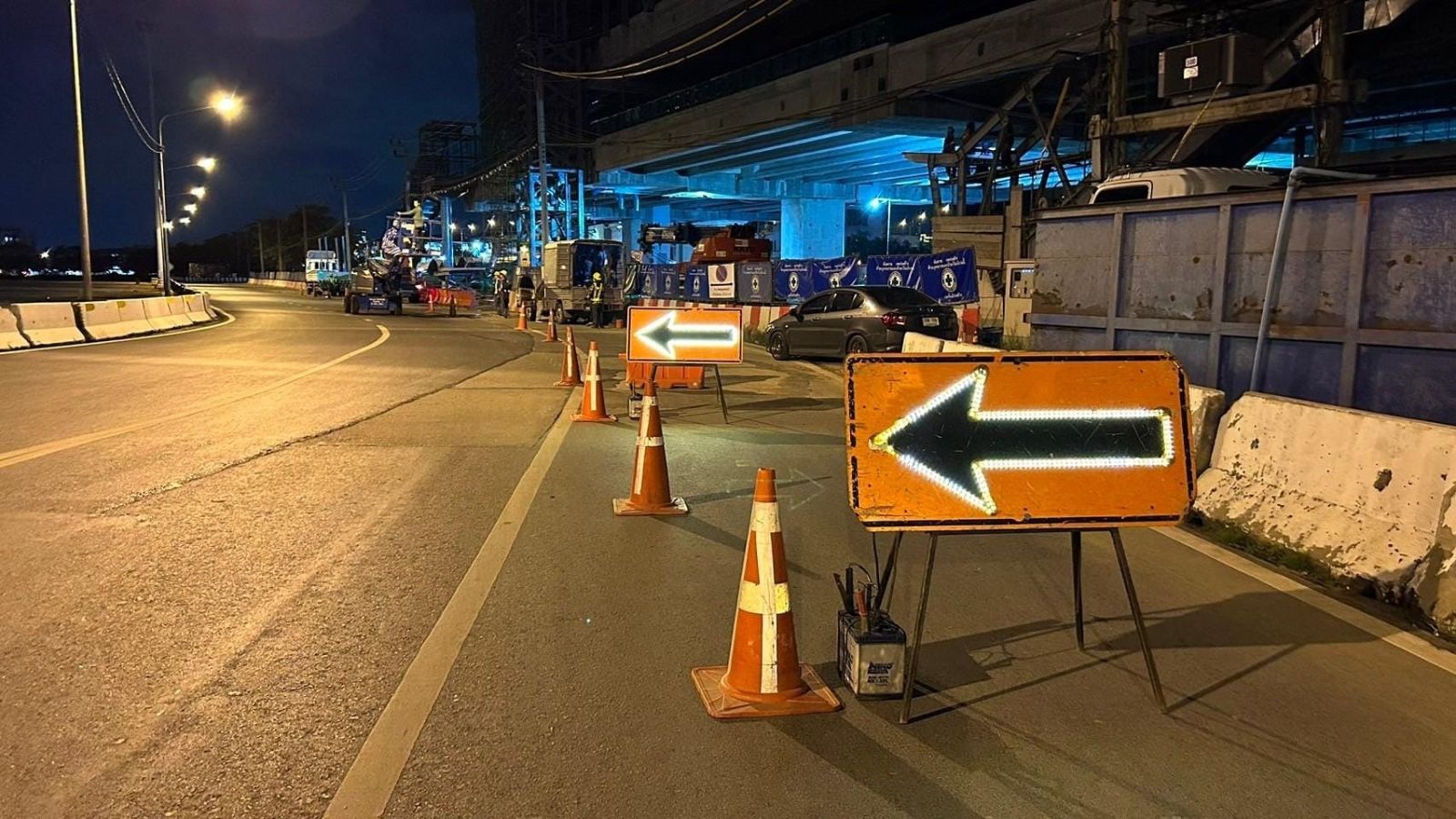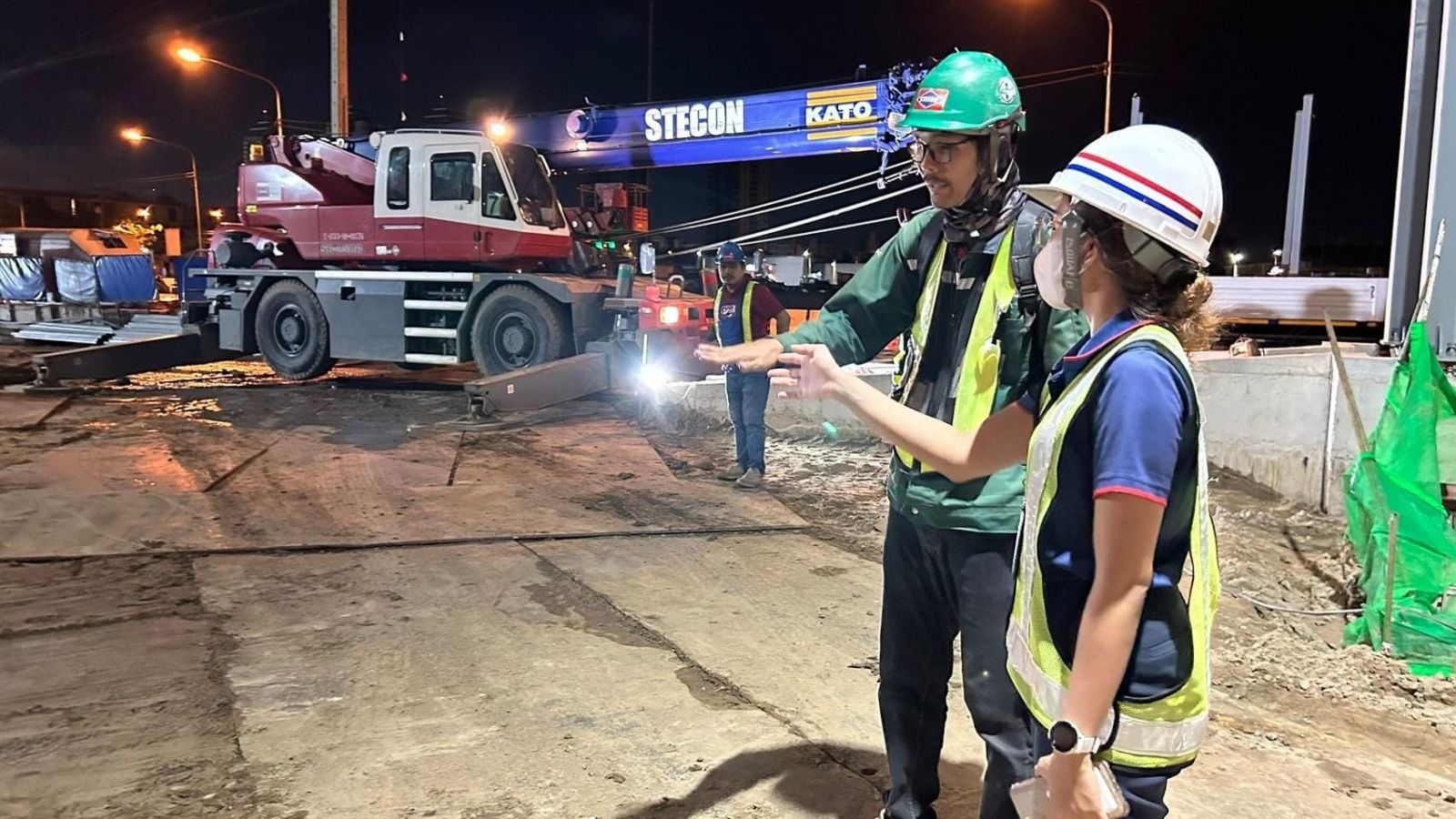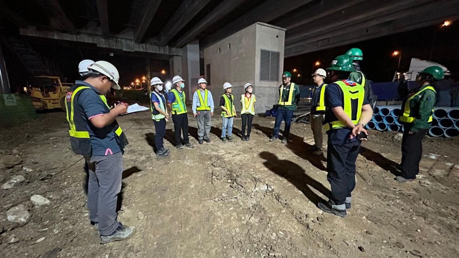 การรถไฟฟ้าขนส่งมวลชนแห่งประเทศไทย (รฟม.) โดยสำนักความปลอดภัย อาชีวอนามัยและสภาพแวดล้อมในการทำงาน (สปอ.) ลงพื้นที่ตรวจความปลอดภัยในการก่อสร้าง โครงการรถไฟฟ้าสายสีชมพูส่วนต่อขยาย ช่วงสถานีศรีรัช – เมืองทองธานี บริเวณสถานีอิมแพ็คเมืองทองธานี (MT01) และสถานีทะเลสาบเมืองทองธานี (MT02) ในช่วงเวลากลางคืน เพื่อตรวจสอบการปฏิบัติงานก่อสร้างให้ได้มาตรฐานตามมาตรการด้านความปลอดภัย โดยตรวจสอบการติดตั้งไฟส่องสว่าง ไฟสัญญาณเตือน ป้ายเตือนต่างๆ และการติดตั้งถังดับเพลิงให้สามารถเห็นได้ชัดเจน รวมทั้งตรวจสอบการตั้งแนวแบริเออร์ให้อยู่ในแนวพื้นที่ไม่ล้ำเข้าพื้นผิวถนน การกั้นแนวเขตห้ามเข้าพร้อมราวกันตก ตลอดจนตรวจสอบความแข็งแรงของบันไดขึ้น – ลง นั่งร้าน และการยึดติดอุปกรณ์ต่างๆ ให้มีความมั่นคงแน่นหนา พร้อมกำชับให้มีการตรวจสอบ Safety Net ที่ใช้ป้องกันเศษวัสดุและเศษฝุ่นละอองจากการก่อสร้างในที่สูงให้มีสภาพดี มีความพร้อมในการใช้งาน