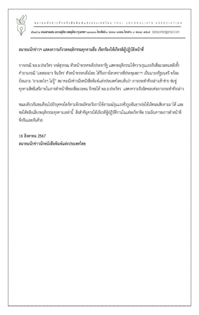 16 สิงหาคม 2567 สมาคมนักข่าวนักหนังสือพิมพ์แห่งประเทศไทย ได้ออกข้อความกรณีการแสดงพฤติกรรมเข้าข่ายกระทำความรุนแรงต่อสื่อมวลชน