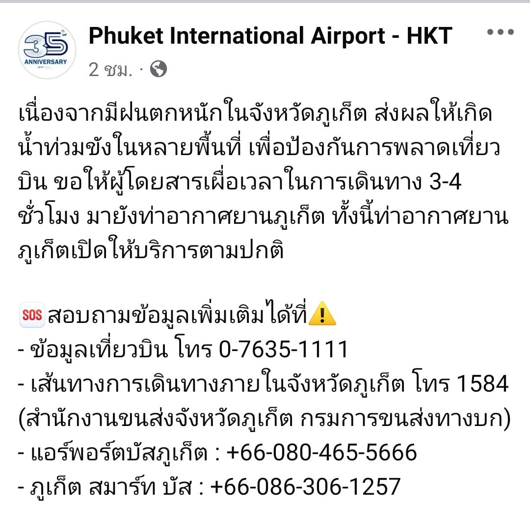 ทางด้าน ท่าอากาศยานภูเก็ต ได้ประกาศผ่านทางเพจ ท่าอากาศยานภูเก็ต ระบุว่า เนื่องจากมีฝนตกหนักในจังหวัดภูเก็ต ส่งผลให้เกิดน้ำท่วมขังในหลายพื้นที่ เพื่อป้องกันการพลาดเที่ยวบิน ขอให้ผู้โดยสารเผื่อเวลาในการเดินทาง 3-4 ชั่วโมง มายังท่าอากาศยานภูเก็ต ทั้งนี้ ท่าอากาศยานภูเก็ตเปิดให้บริการตามปกติ