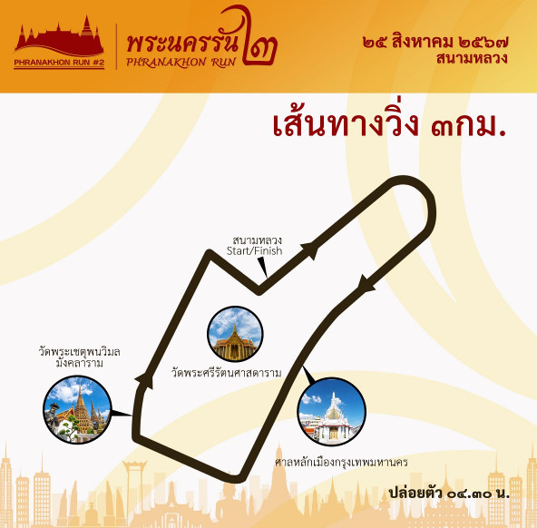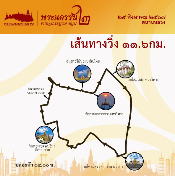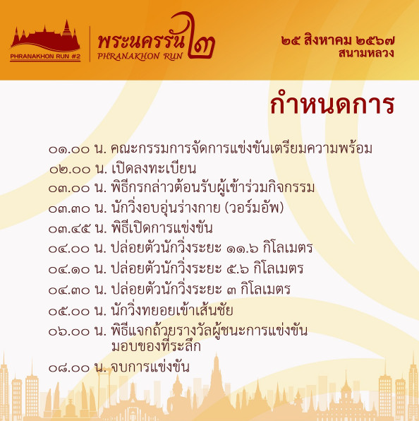 สำหรับกิจกรรมเดิน-วิ่ง “พระนครรัน ครั้งที่ 2” จะมีจุดสตาร์ทที่ท้องสนามหลวง โดยเริ่มวิ่งตั้งแต่เวลา 4.00 น. (ตีสี่) ของวันที่ 25 ส.ค. 2567 และจะสิ้นสุดการแข่งขันภายในเวลา 08.00 น. ซึ่งการจัดกิจกรรมดังกล่าวจะไม่ได้ปิดการจราจร โดยจะมีเจ้าหน้าที่อำนวยความสะดวกด้านการจราจรและดูแลความปลอดภัยให้กับผู้เข้ากิจกรรม เพื่อไม่ให้กระทบต่อผู้ใช้รถใช้ถนน จึงขอให้ประชาชนโปรดวางแผนการเดินทาง ตามวันเวลาดังกล่าว พร้อมขออภัยในความไม่สะดวกมา ณ ที่นี้