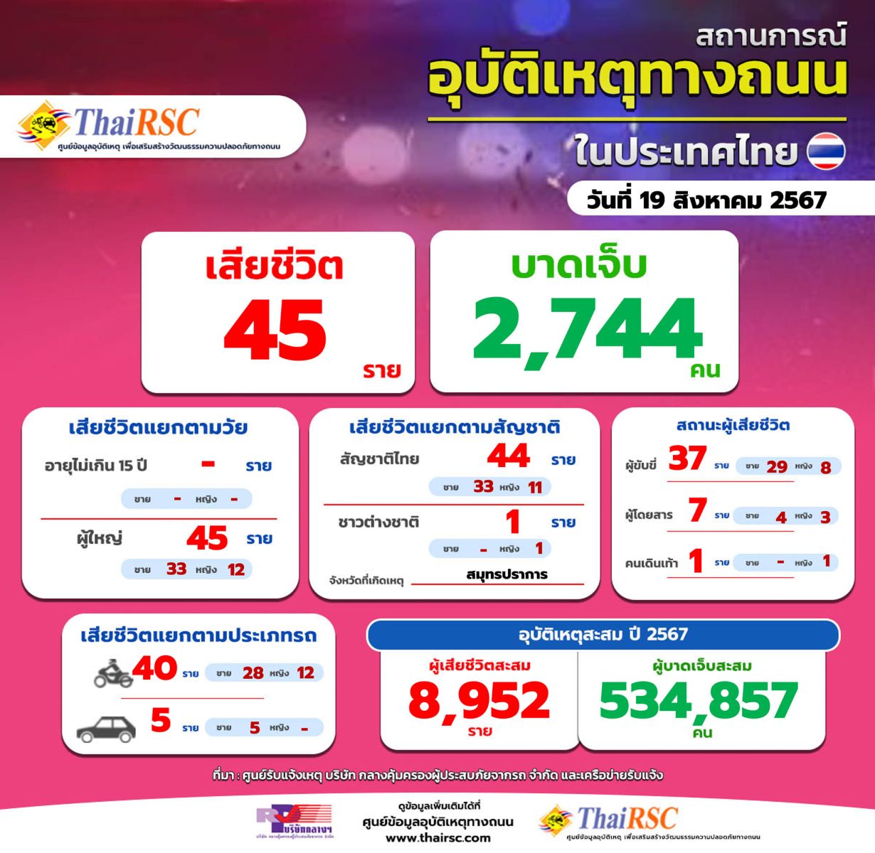 ศูนย์ข้อมูลอุบัติเหตุทางถนน (ThaiRSC) บริษัทกลางฯ เปิดเผยข้อมูลรับเเจ้งอุบัติเหตุทางถนนในรอบ 24 ชม. วันที่ 19 สิงหาคม 2567 ว่ามีผู้เสียชีวิต 45 ราย มีผู้ได้รับบาดเจ็บ 2,744 คน