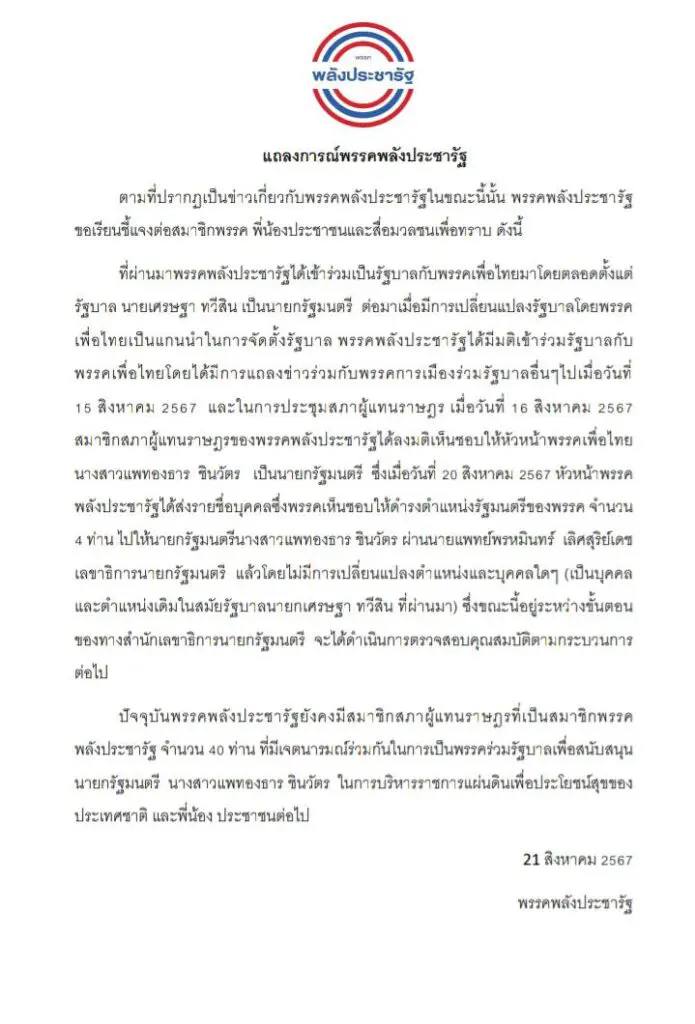 วันนี้ (21 ส.ค.67) ผู้สื่อข่าวรายงานว่า พรรคพลังประชารัฐ ออกแถลงการณ์ผ่านสื่อมวลชน ข้อความว่า ตามที่ปรากฏเป็นข่าวเกี่ยวกับพรรคพลังประชารัฐในขณะนี้นั้น พรรคพลังประชารัฐ ขอเรียนชี้แจงต่อสมาชิกพรรค พี่น้องประชาชนและสื่อมวลชนเพื่อทราบ ดังนี้