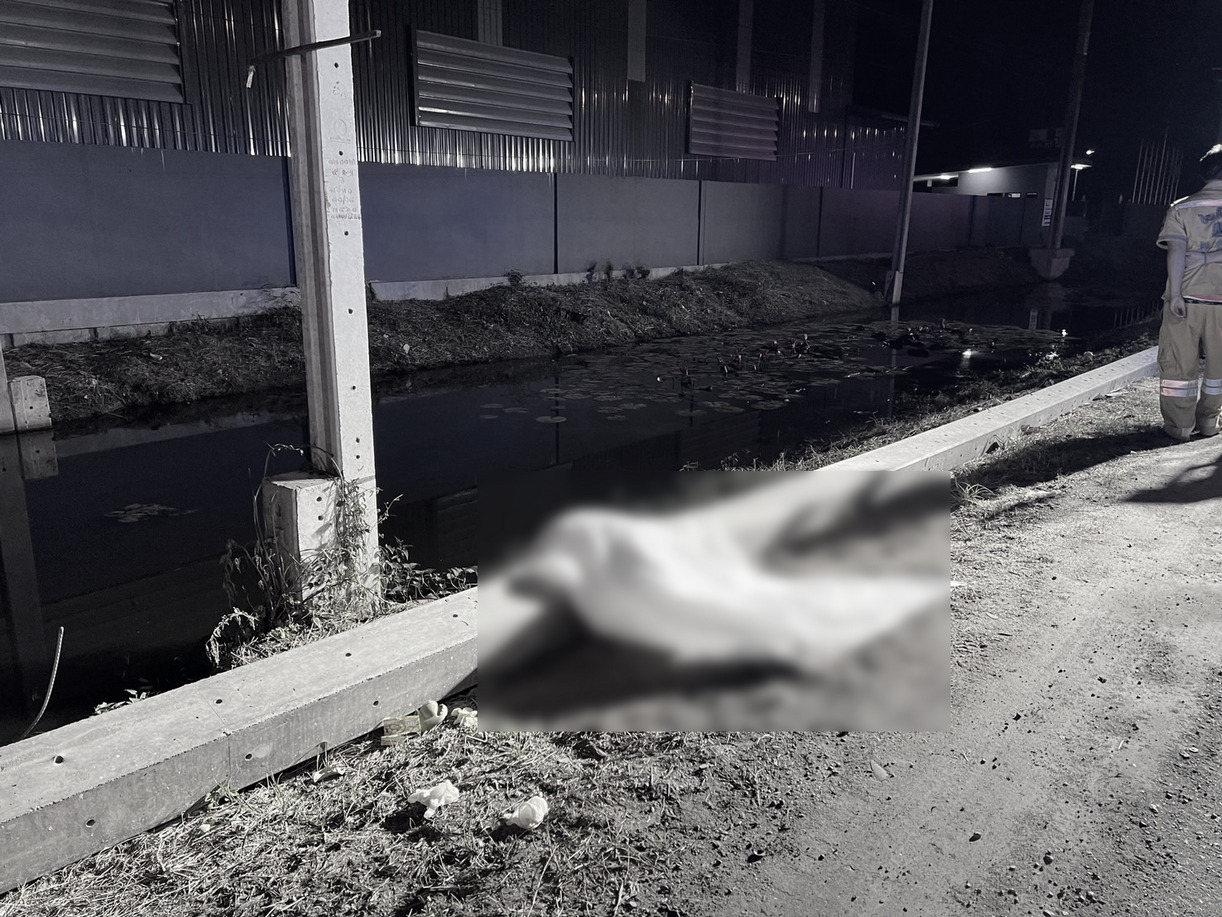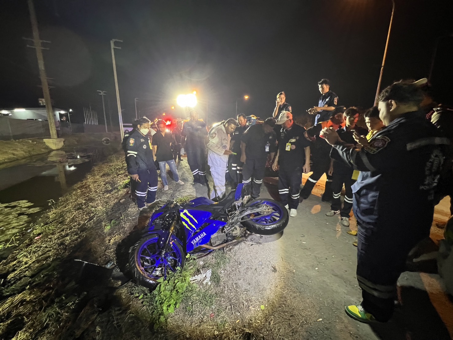 รถจักรยานยนต์ชนเสาปูนข้างทาง ก่อนพุ่งลงคลองน้ำ หนุ่มเมียนมาร่างกระเด็นดับริมถนนปทุมธานี - บางเลน จ.นนทบุรี