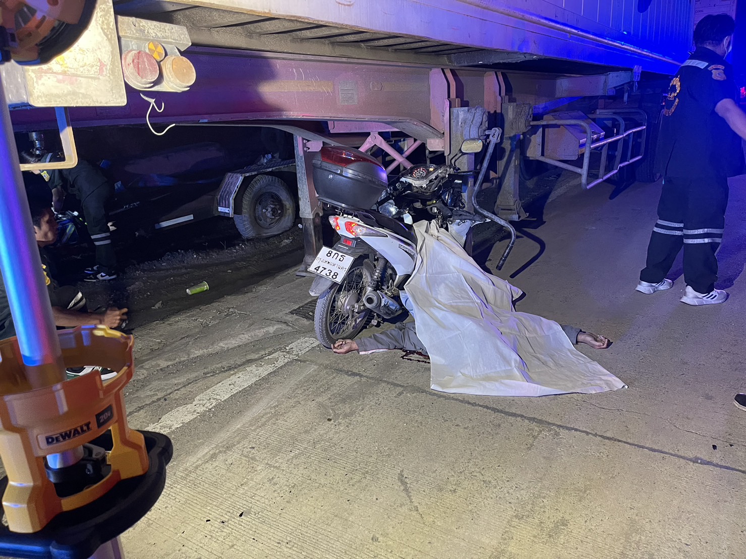 รถจักรยานยนต์ ชนกับตู้คอนเทนเนอร์ที่ถอดไว้ริมถนนคุ้มเกล้า 50 มีผู้เสียชีวิต