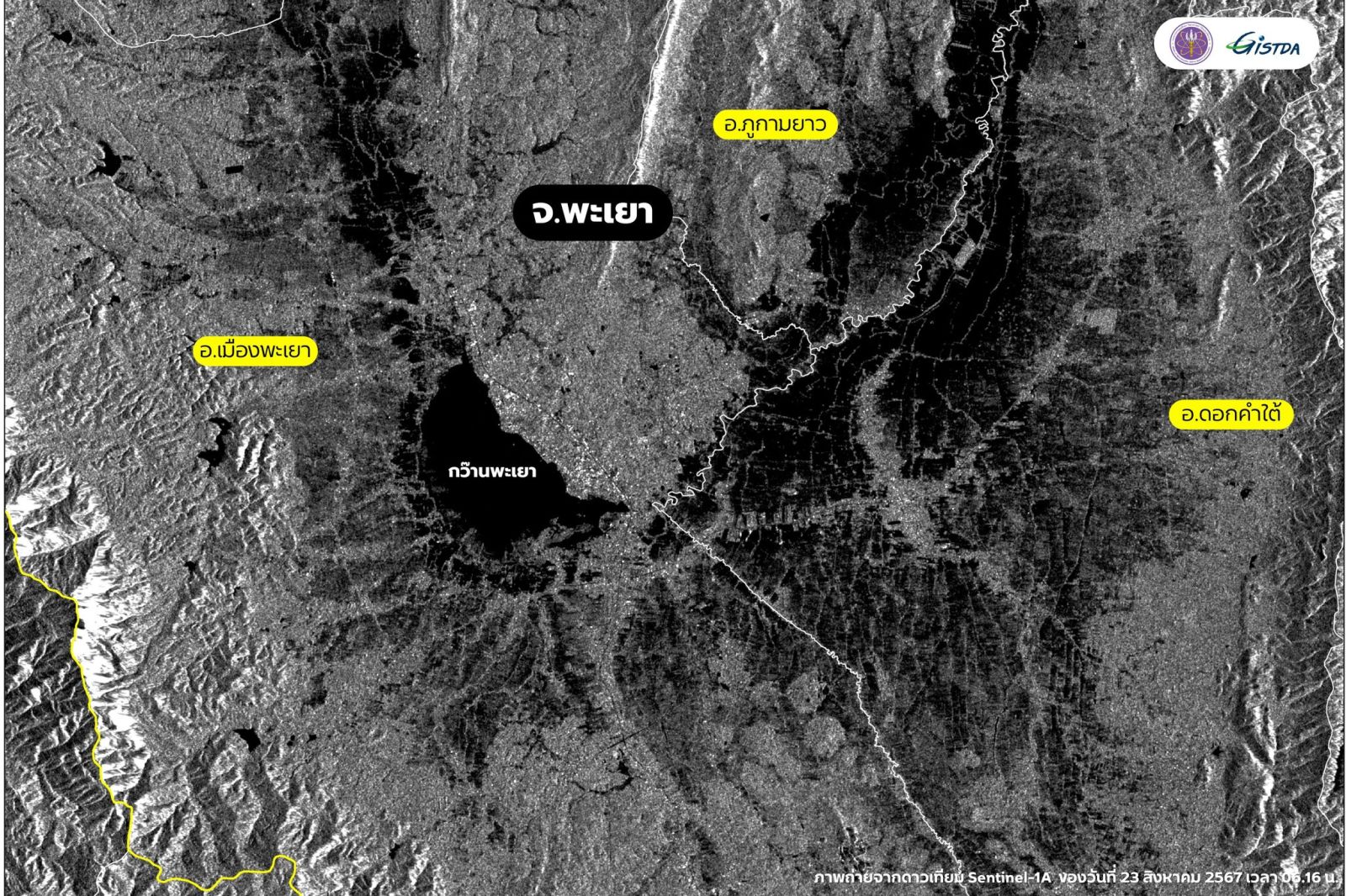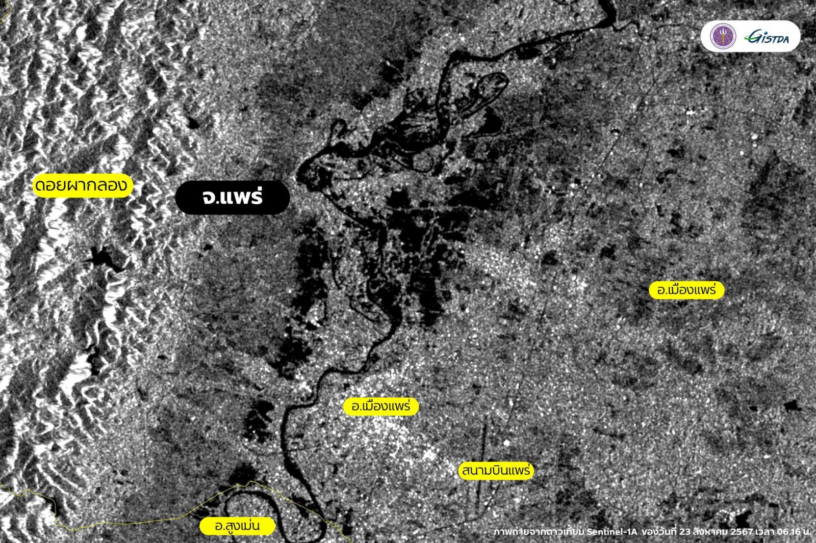 กระทรวงการอุดมศึกษา วิทยาศาสตร์ วิจัยและนวัตกรรม (อว.) โดยสำนักงานพัฒนาเทคโนโลยีอวกาศและภูมิสารสนเทศ หรือ GISTDA ติดตามสถานการณ์น้ำท่วมจากภาพดาวเทียม Sentinel-1A ของวันที่ 23 สิงหาคม 2567 เวลา 06.16 น. พบน้ำท่วมขังในพื้นที่บางส่วนของภาคเหนือ ในพื้นที่จังหวัด