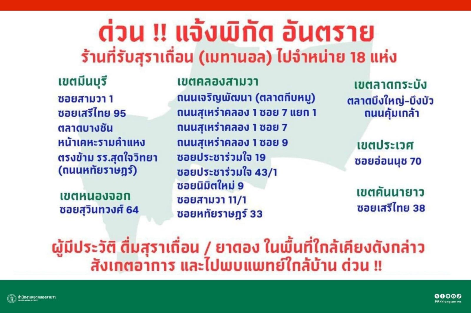 เขตคลองสามวา เตือน !! พบผู้ป่วยเป็นพิษจากการดื่มสุราเถื่อน (เมทานอล) หลายราย ตำรวจสั่งปิดร้านยาดอง ย่านมีนบุรี - คลองสามวา และพื้นที่กรุงเทพฝั่งตะวันออก 24 ส.ค.67 ช่วงบ่าย เจ้าหน้าที่ตำรวจ ได้สืบสวนสอบสวน พบผู้ผลิตสุราเถื่อน (เมทานอล) ที่อาจเป็นพิษกับผู้บริโภค ส่งขายร้านยาดอง ในพื้นที่ใกล้เคียง 18 แห่ง