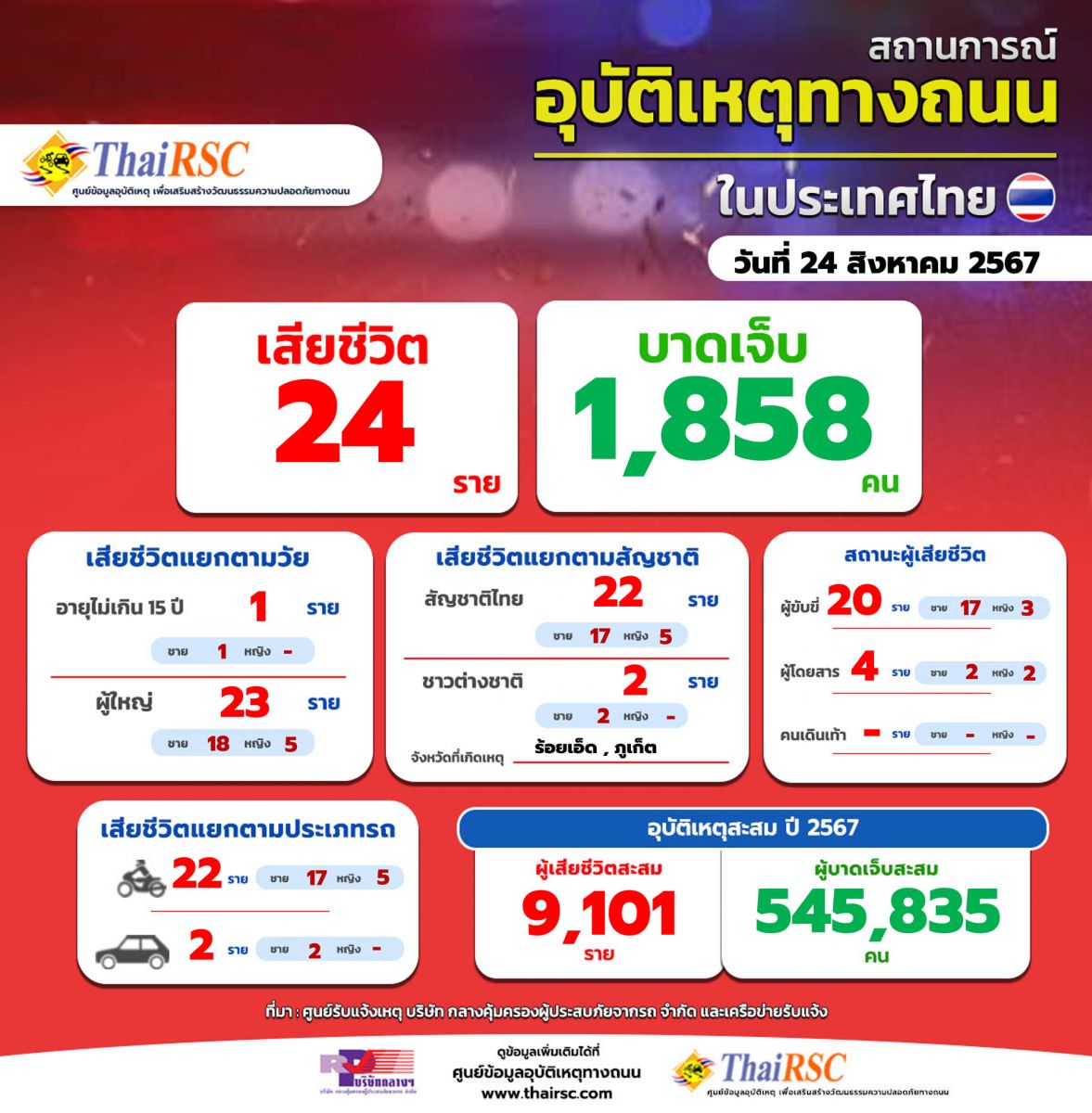 ศูนย์ข้อมูลอุบัติเหตุทางถนน (ThaiRSC) บริษัทกลางฯ เปิดเผยข้อมูลรับเเจ้งอุบัติเหตุทางถนนในรอบ 24 ชม. วันที่ 24 สิงหาคม 2567 ว่ามีผู้เสียชีวิต 24 ราย มีผู้ได้รับบาดเจ็บ 1,858 คน