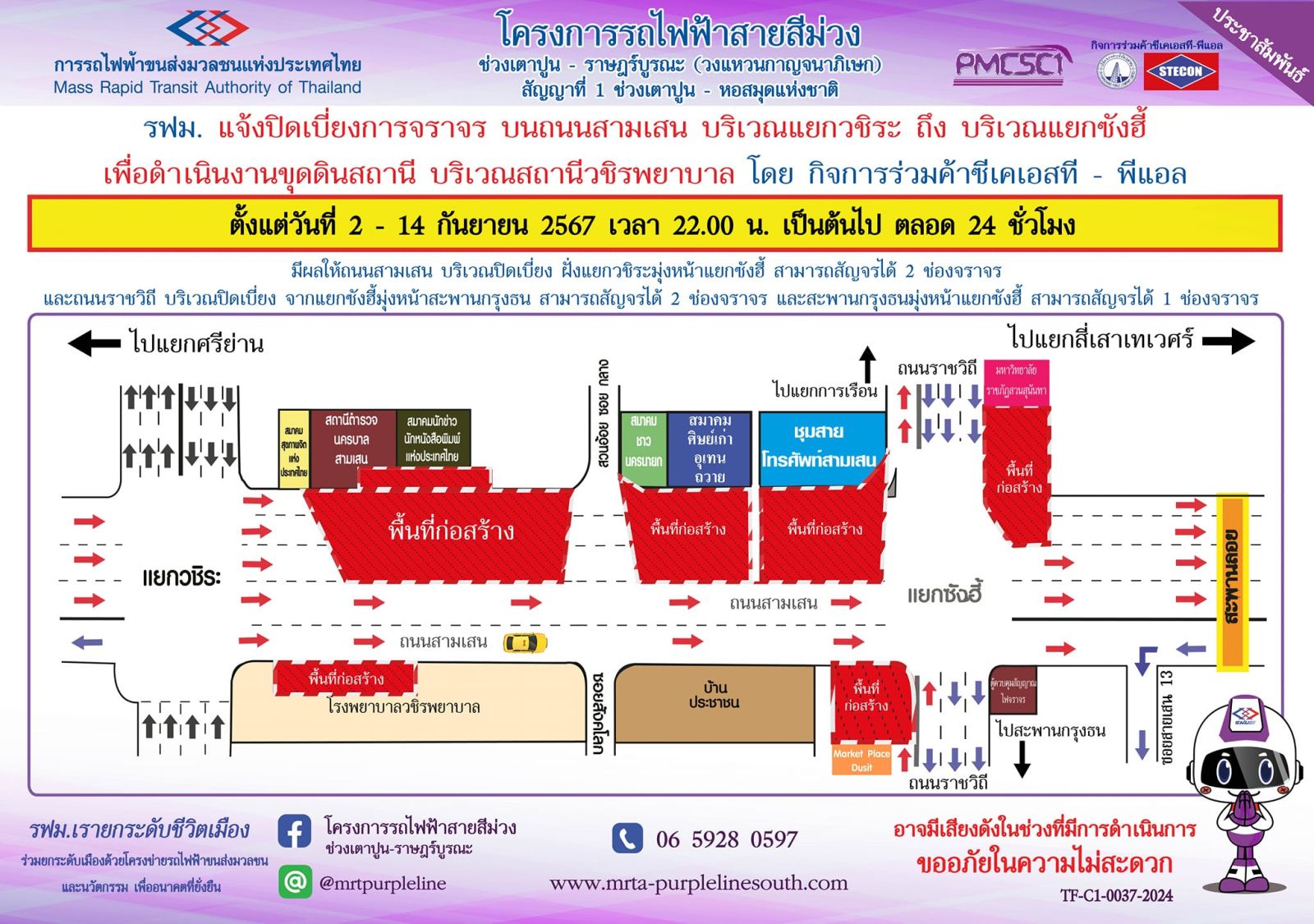 การรถไฟฟ้าขนส่งมวลชนแห่งประเทศไทย (รฟม.) แจ้งว่า กิจการร่วมค้า ซีเคเอสที-พีแอล ผู้รับจ้างออกแบบและก่อสร้างอุโมงค์ทางวิ่งและสถานีใต้ดิน โครงการรถไฟฟ้าสายสีม่วง ช่วงเตาปูน - ราษฎร์บูรณะ (วงแหวนกาญจนาภิเษก) สัญญาที่ 1 ช่วงเตาปูน - หอสมุดแห่งชาติ มีความจำเป็นต้องปิดเบี่ยงจราจรบนถนนสามเสน บริเวณแยกวชิระ ถึง แยกซังฮี้ เพื่อดำเนินงานขุดดินสถานี บริเวณสถานีวชิรพยาบาล ตั้งแต่วันที่ 2 – 14 กันยายน 2567 เวลา 22.00 น. เป็นต้นไป ตลอด 24 ชั่วโมง มีผลให้ถนนสามเสนบริเวณปิดเบี่ยง ฝั่งแยกวชิระมุ่งหน้าแยกซังฮี้ สามารถสัญจรได้ 2 ช่องจราจร และถนนราชวิถีบริเวณปิดเบี่ยง จากแยกซังฮี้มุ่งหน้าสะพานกรุงธนสามารถสัญจรได้ 2 ช่องจราจร และสะพานกรุงธนมุ่งหน้าแยกซังฮี้สามารถสัญจรได้ 1 ช่องจราจร ทั้งนี้ ประชาชนสามารถเข้า-ออกที่พักอาศัยได้ตามปกติ