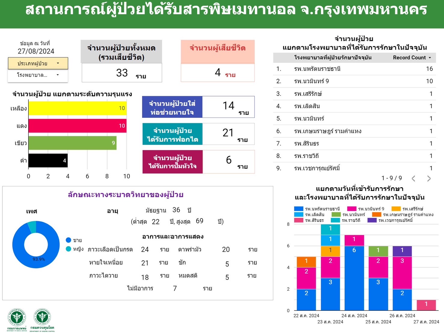 วันที่ 27 ส.ค. รายงานข่าวแจ้งว่า จากการเฝ้าระวังของศูนย์ปฏิบัติการฉุกเฉินด้านการแพทย์และสาธารณสุข (วอร์รูม) ติดตามปัญหาผลกระทบจากสุราปลอม ที่มีการลักลอบผสมสารเมทานอล ซึ่งเป็นสารที่ห้ามใช้ในผลิตภัณฑ์อาหาร เนื่องจาก เป็นสารที่ใช้ในอุตสาหกรรมการผลิตสีทินเนอร์ห้ามรับประทานโดยเด็ดขาด ว่า จากการสรุปข้อมูลล่าสุดเมื่อเวลา 09.00 น วันนี้ (27 ส.ค.) มีผู้ป่วยสะสม จำนวน 33 ราย ในจำนวนนี้เสียชีวิต เพิ่มอีก 1 รายรวมเป็น 4 ราย