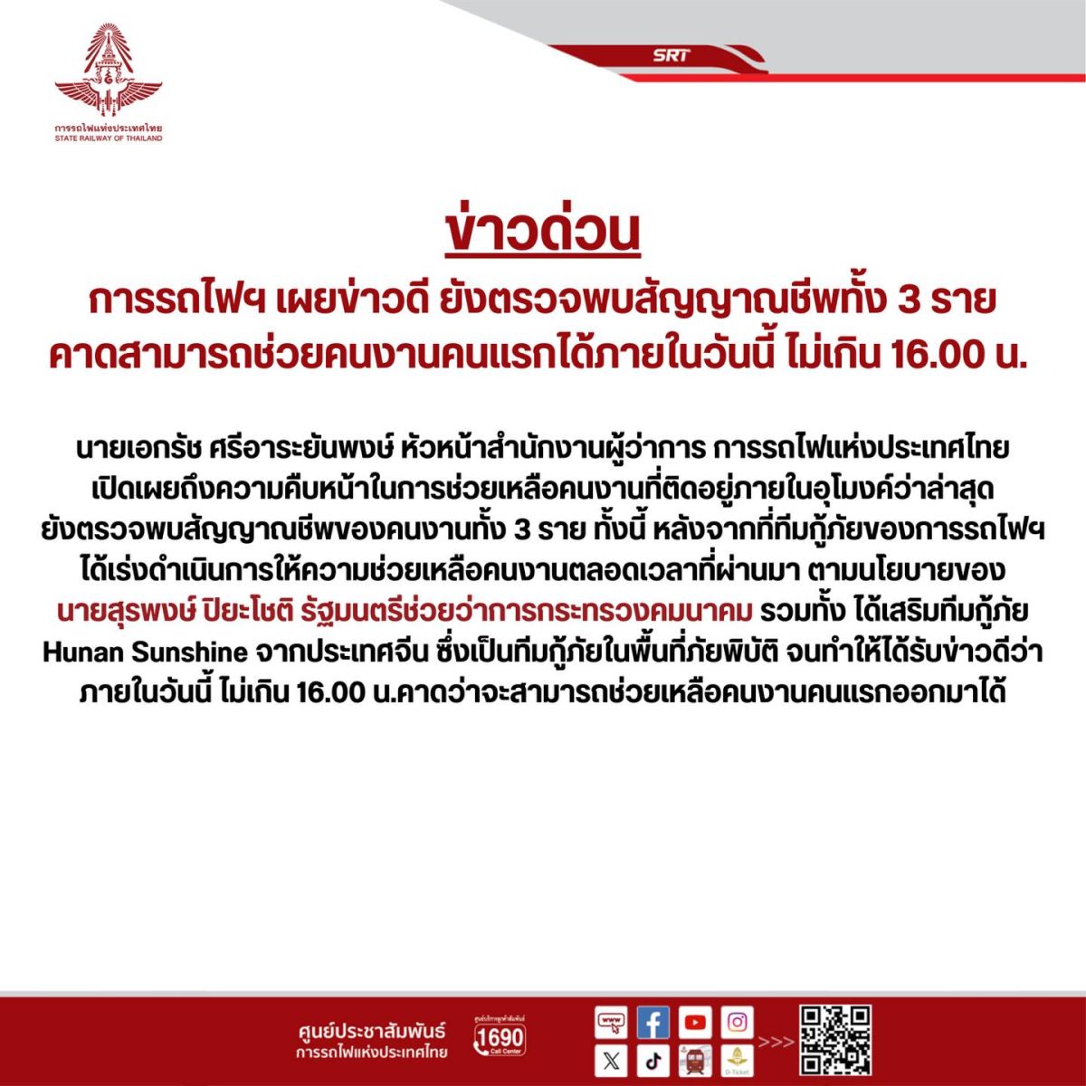 นายเอกรัช ศรีอาระยันพงษ์ หัวหน้าสำนักงานผู้ว่าการ การรถไฟแห่งประเทศไทย เปิดเผยถึงความคืบหน้าในการช่วยเหลือคนงานที่ติดอยู่ภายในอุโมงค์ว่า ล่าสุด ยังตรวจพบสัญญาณชีพของคนงานทั้ง 3 ราย ทั้งนี้ หลังจากที่ทีมกู้ภัยของการรถไฟฯ ได้เร่งดำเนินการให้ความช่วยเหลือคนงานตลอดเวลาที่ผ่านมา ตามนโยบายของนายสุรพงษ์