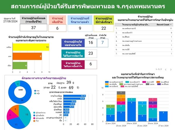ทั้งนี้ ผู้ป่วยที่กำลังรักษาอยู่ 22 ราย กระจายอยู่ใน โรงพยาบาลนพรัตนราชธานี 11 ราย, โรงพยาบาลเลิดสิน 1 ราย, โรงพยาบาลราชวิถี 1 ราย และ โรงพยาบาลเอกชน อีก 9 ราย ในจำนวนนี้มีผู้ป่วยอาการรุนแรงใส่ท่อช่วยหายใจ 7 ราย