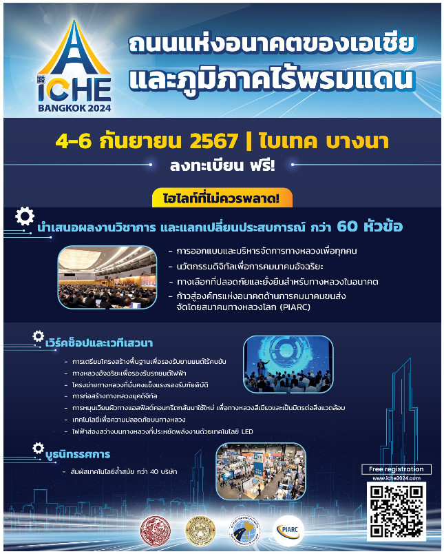 เตรียมพบกับการปฏิวัติวงการคมนาคมครั้งใหญ่! กรมทางหลวง กระทรวงคมนาคม ร่วมกับ สมาคมทางหลวงแห่งประเทศไทย พร้อมเปิดเวทีวิศวกรรมงานทางระดับโลกจัดงานประชุมวิชาการระดับนานาชาติ “ The 5th International Conference on Highway Engineering (iCHE 2024) ” ระหว่างวันที่ 4 - 6 กันยายน 2567 ณ ศูนย์นิทรรศการและการประชุมไบเทค บางนา กรุงเทพฯ