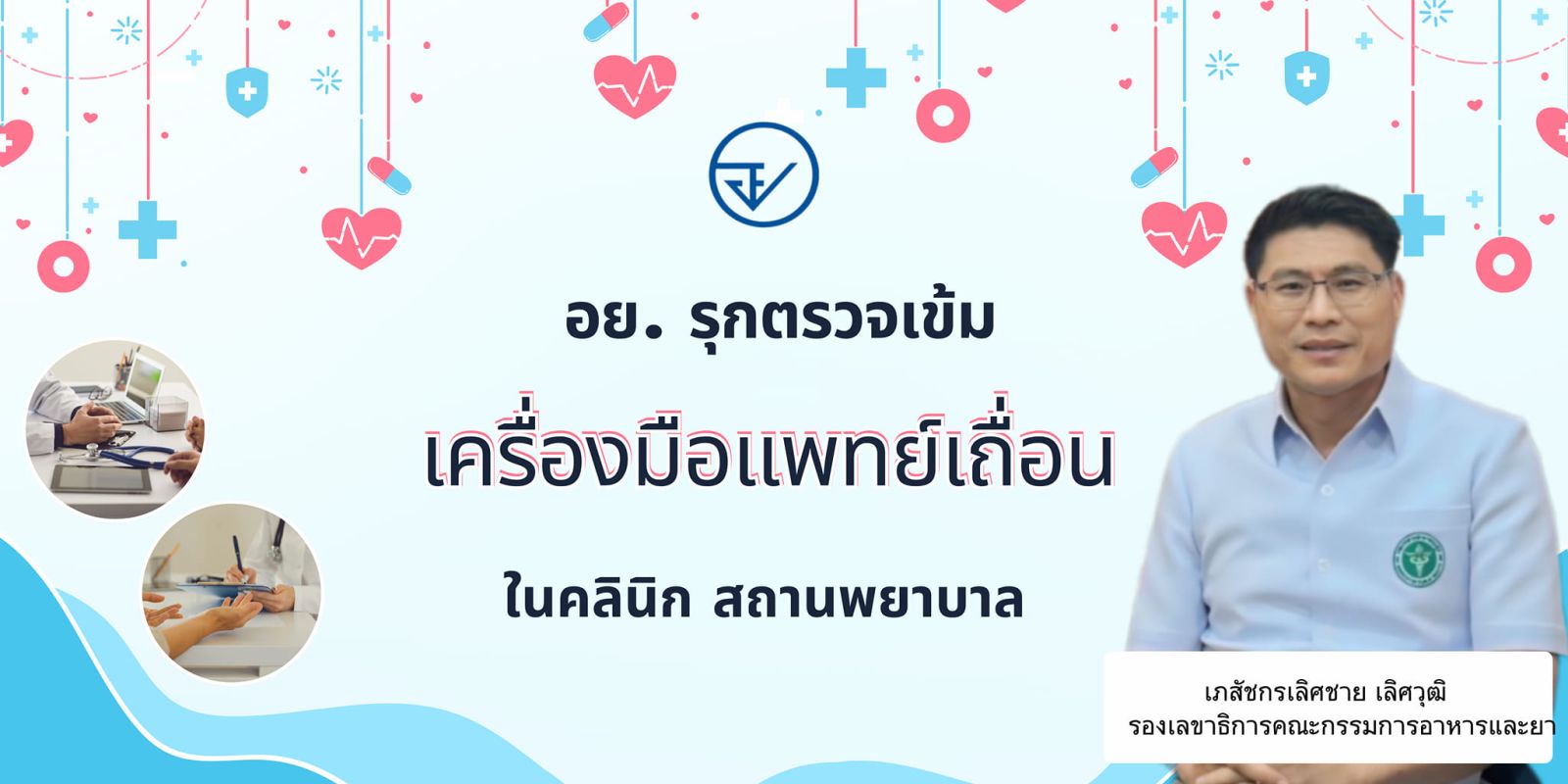 อย. เพิ่มมาตรการตรวจสอบและเฝ้าระวังการใช้ผลิตภัณฑ์เครื่องมือแพทย์เถื่อนในคลินิก สถานพยาบาล เพื่อคุ้มครองความปลอดภัยผู้บริโภค แนะตรวจสอบผลิตภัณฑ์เครื่องมือแพทย์ก่อนรับบริการ หากเกิดความผิดปกติหลังจากใช้เครื่องมือแพทย์ ประชาชนสามารถแจ้งหน่วยงานได้ผ่านช่องทางสายด่วน อย. 1556