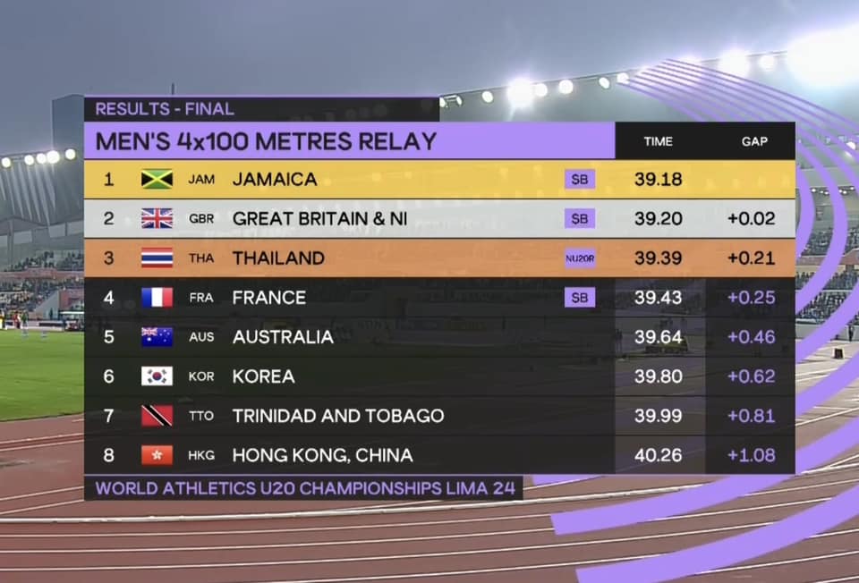 โดยเหรียญทอง เป็นของประเทศจาไมก้า ?? สถิติ 39.18 วินาที เหรียญเงิน เป็นของสหราชอาณาจักร สถิติ 39.20 วินาที