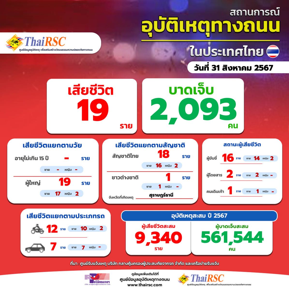 ศูนย์ข้อมูลอุบัติเหตุทางถนน (ThaiRSC) บริษัทกลางฯ เปิดเผยข้อมูลรับเเจ้งอุบัติเหตุทางถนนในรอบ 24 ชม. วันที่ 31 สิงหาคม 2567 ว่ามีผู้เสียชีวิต 19 ราย มีผู้ได้รับบาดเจ็บ 2,093 คน