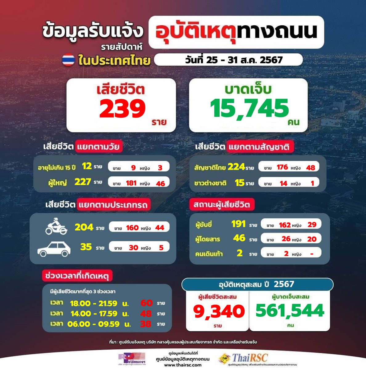 ส่วนข้อมูลรับเเจ้งอุบัติเหตุทางถนน รายสัปดาห์ ระหว่างวันที่ 25-31 สิงหาคม 2567 มีผู้เสียชีวิต 239 ราย บาดเจ็บ 15,745 คน