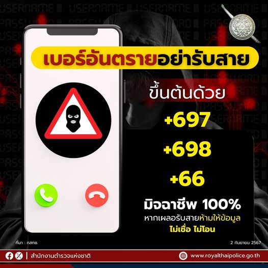 2 กันยายน 2567 เพจเฟซบุ๊ก สำนักงานตำรวจแห่งชาติ แจ้งเตือนเบอร์โทรศัพท์ของกลุ่มมิจฉาชีพ ขอให้ประชาชนระมัดระวังการรับสายจากเบอร์ที่ขึ้นต้นด้วยเลขดังกล่าว โดยระบุว่า "อย่ารับสาย เบอร์อันตรายกลับมาระบาดอีกแล้ว เบอร์โทรศัพท์ขึ้นต้นด้วย +697, +698 หรือ +66 หากมีเบอร์โทรลักษณะเช่นนี้โทรมา จำไว้เลย มิจฉาชีพแน่นอน อย่ารับสายเด็ดขาด