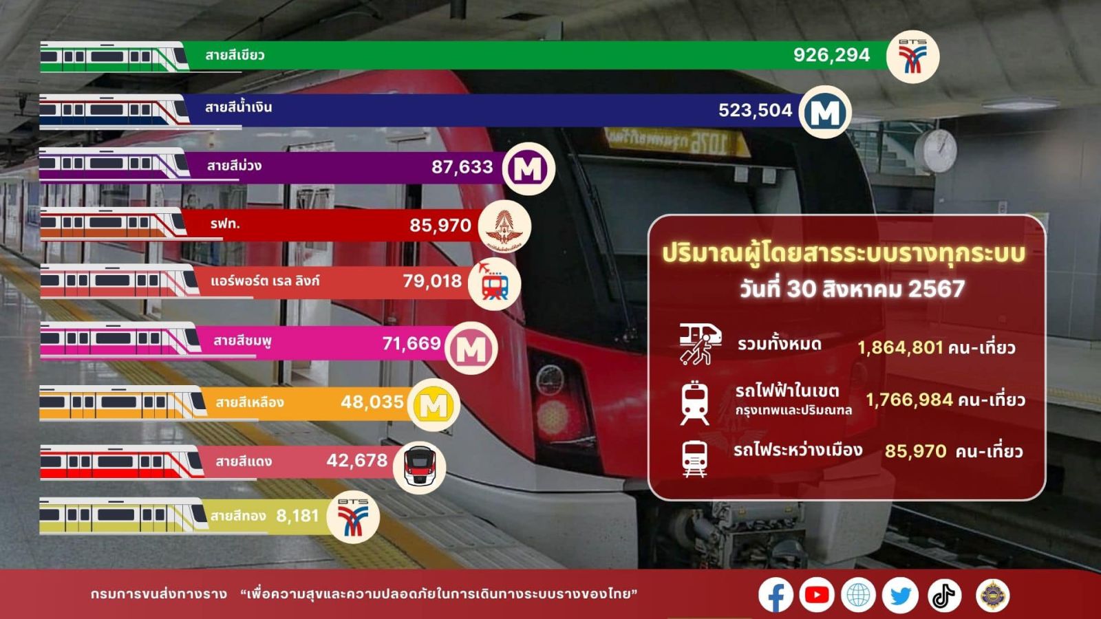 โดยเมื่อวันศุกร์ที่ 30 สิงหาคม 2567 ที่ผ่านมา กรมการขนส่งทางราง ได้รายงานว่า มีผู้ใช้บริการรถไฟฟ้าสายฉลองรัชธรรม (สีม่วง) จำนวน 87,633 คน/เที่ยว และรถไฟฟ้าสายสีแดง จำนวน 42,678 คน/เที่ยว ซึ่งถือว่ารถไฟฟ้าทั้งสองสาย มีจำนวนผู้โดยสารใช้บริการสูงสุดตั้งแต่เปิดให้บริการ