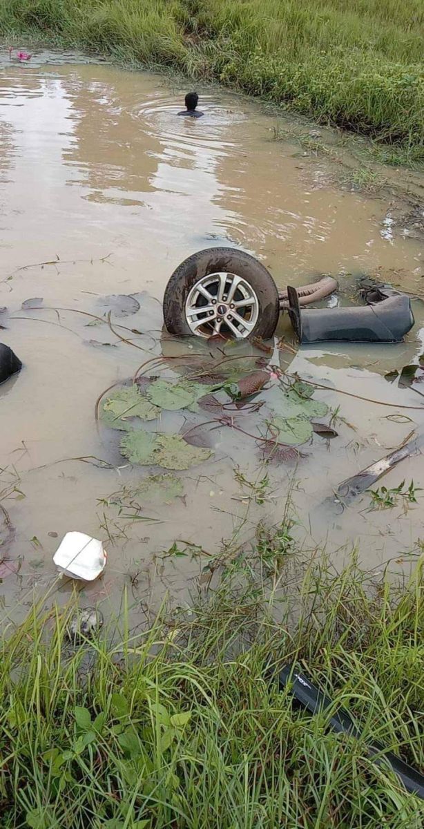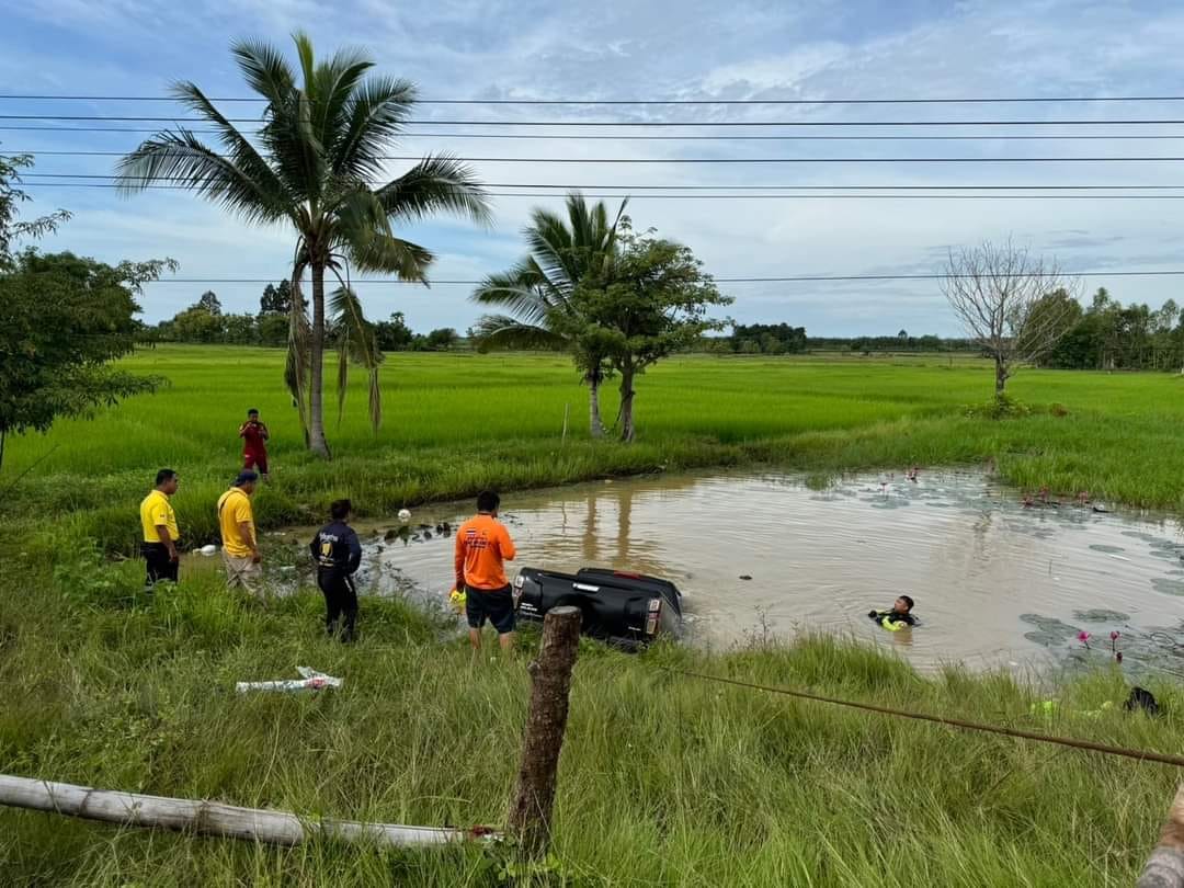 รถกระบะเสียหลักพุ่งลงจมในสระน้ำข้างทาง หนุ่มนักวิชาการ รพ.สต. เสียชีวิตภายในยานพาหนะ จ.อุดรธานี