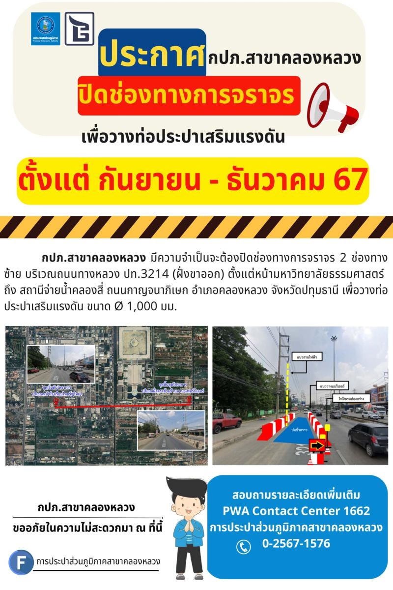 กปภ.สาขาคลองหลวง มีความจำเป็นจะต้องปิดช่องทางการจราจร 2 ช่องทางซ้าย บริเวณถนนทางหลวง ปท.3214 (ฝั่งขาออก) ตั้งแต่หน้า ม.ธรรมศาสตร์ ถึง สถานีจ่ายน้ำคลองสี่ ถนนกาญจนาภิเษก อ.คลองหลวง จ.ปทุมธานี เพื่อวางท่อประปาเสริมแรงดัน ขนาดเส้นผ่านศูนย์กลาง 1,000 มม.