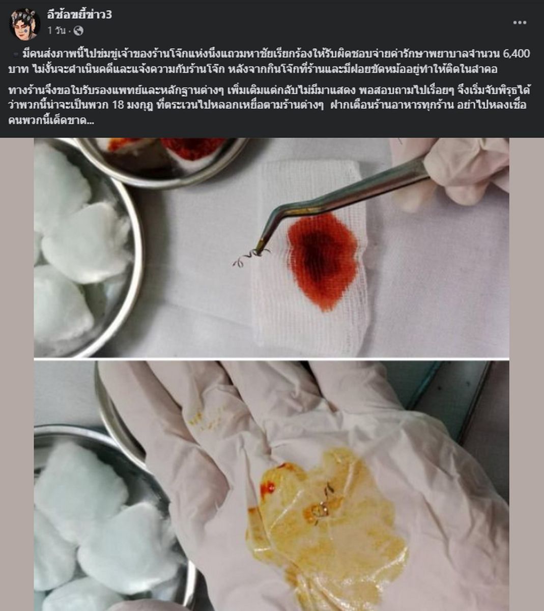 โดยระบุข้อความว่า "มีคนส่งภาพนี้ไปข่มขู่เจ้าของร้านโจ๊กแห่งนึงแถวมหาชัย เรียกร้องให้รับผิดชอบจ่ายค่ารักษาพยาบาลจำนวน 6,400 บาท ไม่งั้นจะดำเนินคดีและแจ้งความกับร้านโจ๊ก หลังจากกินโจ๊กที่ร้านและมีฝอยขัดหม้ออยู่ทำให้ติดในลำคอ"